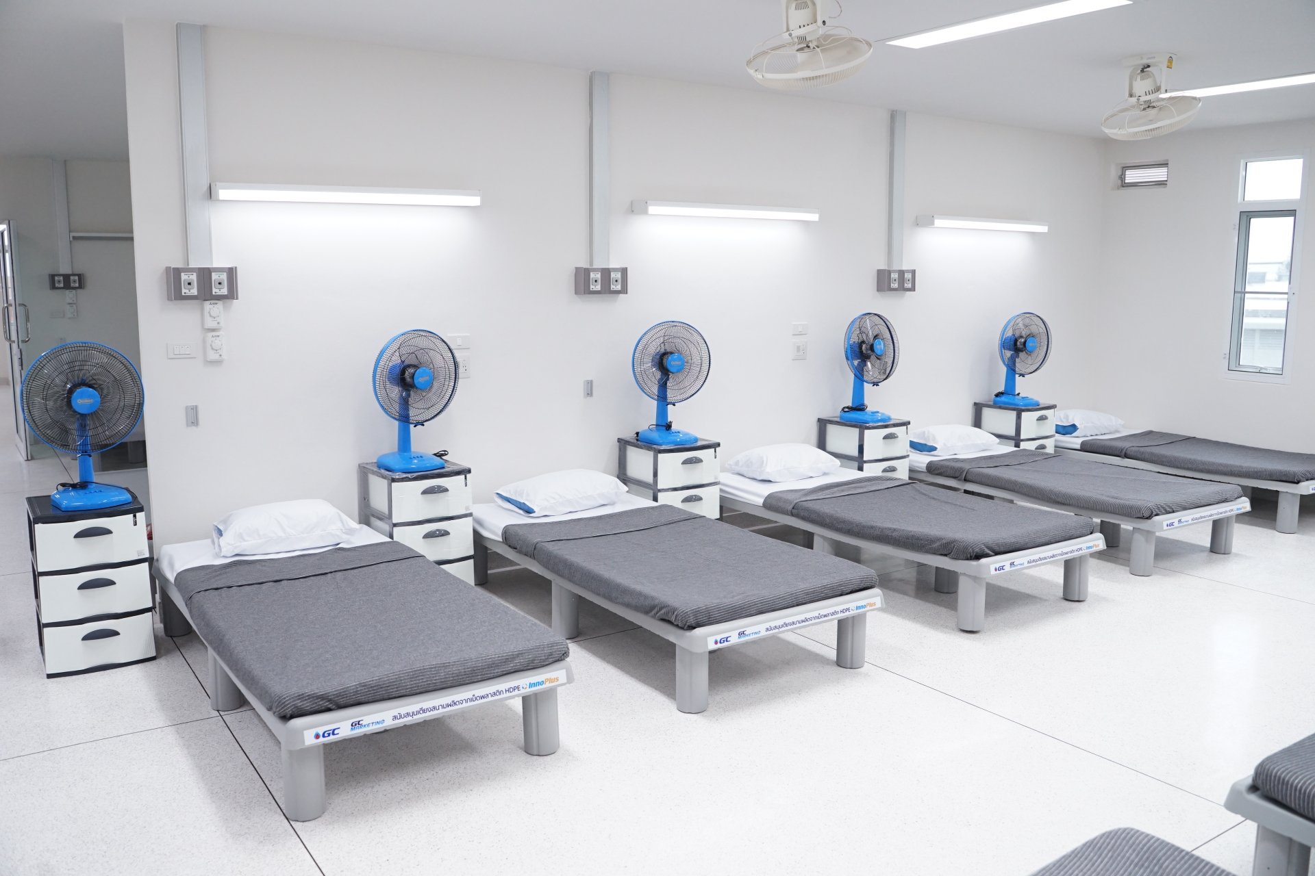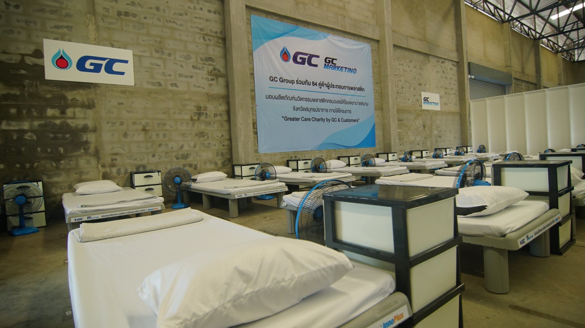 • เตียงสนามจาก HDPE (พร้อมอุปกรณ์เครื่องนอนครบชุด) จำนวน 1,000 เตียง ผลิตจากเม็ดพลาสติก HDPE ภายใต้แบรนด์ InnoPlus ของ GC ออกแบบและผลิตโดยบริษัทแอร์โรคลาส จำกัด คู่ค้าของ GC เตียงสามารถถอดประกอบได้ง่ายด้วยคนเพียงคนเดียวภายในเวลาไม่ถึง 5 นาที ขนาดใหญ่ (กว้าง 91 ซม. ยาว 210 ซม. สูง 30 ซม.) น้ำหนักเบาเพียง 21 กิโลกรัม มีความแข็งแรงทนทาน รับน้ำหนักได้มากถึง 200 กิโลกรัม ป้องกันสารคัดหลั่งซึมผ่าน สามารถฆ่าเชื้อได้ง่ายทั้งด้วยน้ำยาและผ่านความร้อน จึงนำกลับมาใช้ซ้ำได้หลายครั้ง รวมถึงสามารถนำกลับมารีไซเคิลได้ในที่สุด
