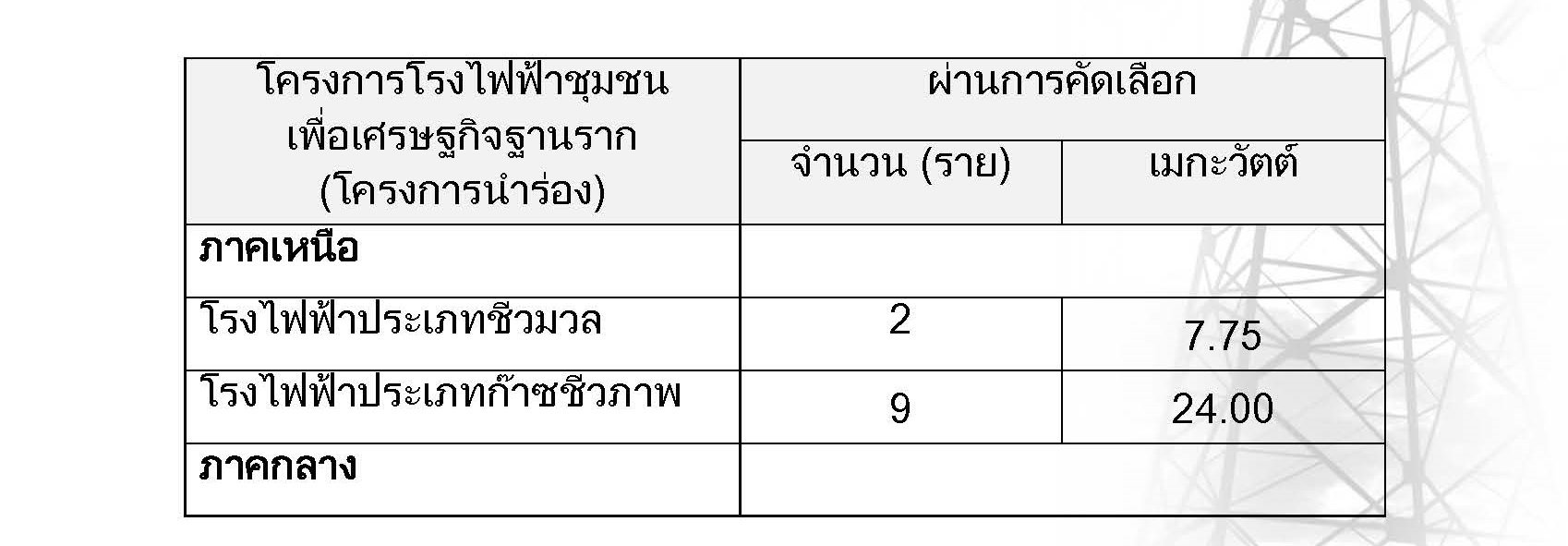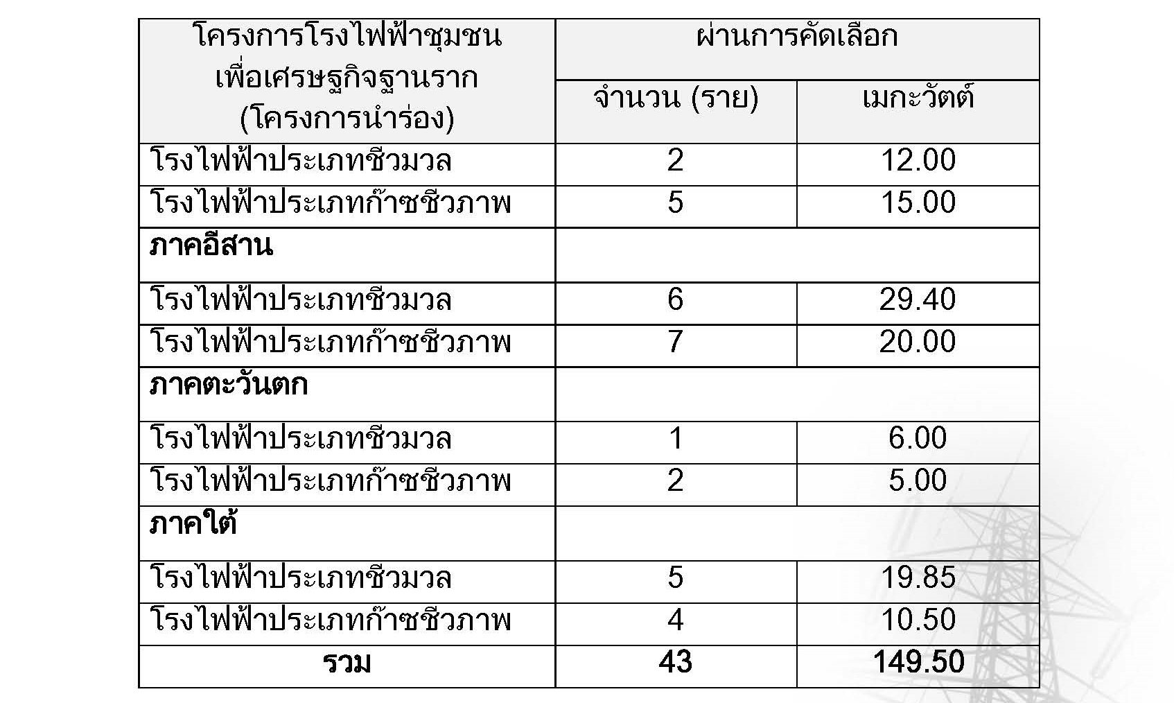 นายคมกฤช ตันตระวาณิชย์ เลขาธิการสำนักงานคณะกรรมการกำกับกิจการพลังงาน (สำนักงาน กกพ.) ในฐานะโฆษกคณะกรรมการกำกับกิจการพลังงาน (กกพ.) เปิดเผยว่า มีผู้ได้รับการคัดเลือกเข้าร่วมโครงการโรงไฟฟ้าชุมชนเพื่อเศรษฐกิจฐานราก (โครงการนำร่อง) จำนวนทั้งสิ้น 43 ราย คิดเป็นปริมาณพลังไฟฟ้าเสนอขายรวม 149.50 เมกะวัตต์ (ค่าไฟฟ้าเสนอขายเฉลี่ย 3.1831 บาทต่อหน่วย) แบ่งเป็นโรงไฟฟ้าชุมชนประเภทชีวมวลจำนวน 16 ราย ปริมาณพลังไฟฟ้าเสนอขายรวม 75.00 เมกะวัตต์ (ค่าไฟฟ้าเสนอขายเฉลี่ย 2.7972 บาทต่อหน่วย) และโรงไฟฟ้าชุมชนประเภทก๊าซชีวภาพรวม 27 ราย ปริมาณพลังไฟฟ้าเสนอขายรวม 74.50 เมกะวัตต์ (ค่าไฟฟ้าเสนอขายเฉลี่ย 3.5717 บาทต่อหน่วย) ตามกรอบเป้าหมายการรับซื้อไฟฟ้าที่คณะกรรมการนโยบายพลังงานแห่งชาติ (กพช.) กำหนดเป้าหมายจากเชื้อเพลิงชีวมวล 75 เมกะวัตต์ และเชื้อเพลิงก๊าซชีวภาพ 75 เมกะวัตต์ ทั้งนี้ สามารถแยกเป็นรายภาคได้ดังนี้
