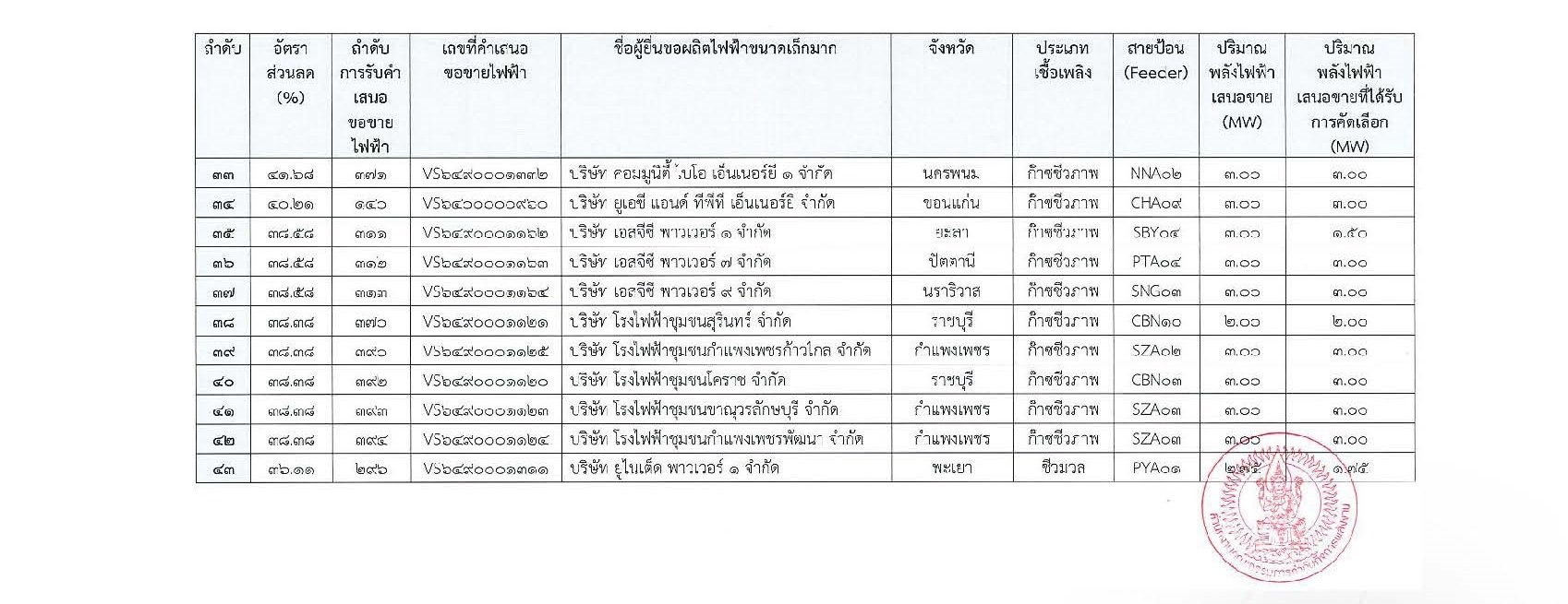 สำหรับรายชื่อผู้ที่ผ่านการคัดเลือกเพื่อเสนอขายไฟฟ้าตามอัตราส่วนลด (%) FITF ในโครงการโรงไฟฟ้าชุมชนเพื่อเศรษฐกิจฐานราก (โครงการนำร่อง) จำนวน 43 ราย มีดังต่อไปนี้