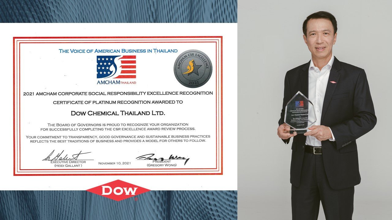 รางวัลองค์กรที่มีความรับผิดชอบต่อสังคมดีเด่น (AMCHAM CSR Excellence Awards) จัดขึ้นเป็นประจำทุกปี เพื่อยกย่องบริษัทสมาชิกหอการค้าอเมริกันในประเทศไทยที่เป็นแบบอย่างในการดำเนินงานด้านธุรกิจควบคู่กับการดูแลสังคม จากการส่งเสริมให้พนักงานมีส่วนร่วมในการทำกิจกรรมเพื่อสังคมอย่างต่อเนื่อง รวมถึงความมุ่งมั่นผลักดันการแก้ปัญหาสิ่งแวดล้อมอย่างยั่งยืน และสร้างชุมชนที่ทุกคนมีส่วนร่วม ส่งผลให้ Dow ได้รับการยกย่องให้เป็นองค์กรที่มีความรับผิดชอบต่อสังคมดีเด่นเป็นปีที่ 11 ติดต่อกัน ส่วนรางวัล The Ambassador’s Award เป็นรางวัลพิเศษ ซึ่งมอบให้กับองค์กรที่มีผลงานโดดเด่นในการส่งเสริมเทคโนโลยีคาร์บอนต่ำโดยถ่ายทอดนวัตกรรมล่าสุดจากสหรัฐอเมริกาให้กับหน่วยงานต่าง ๆ ในประเทศไทย
