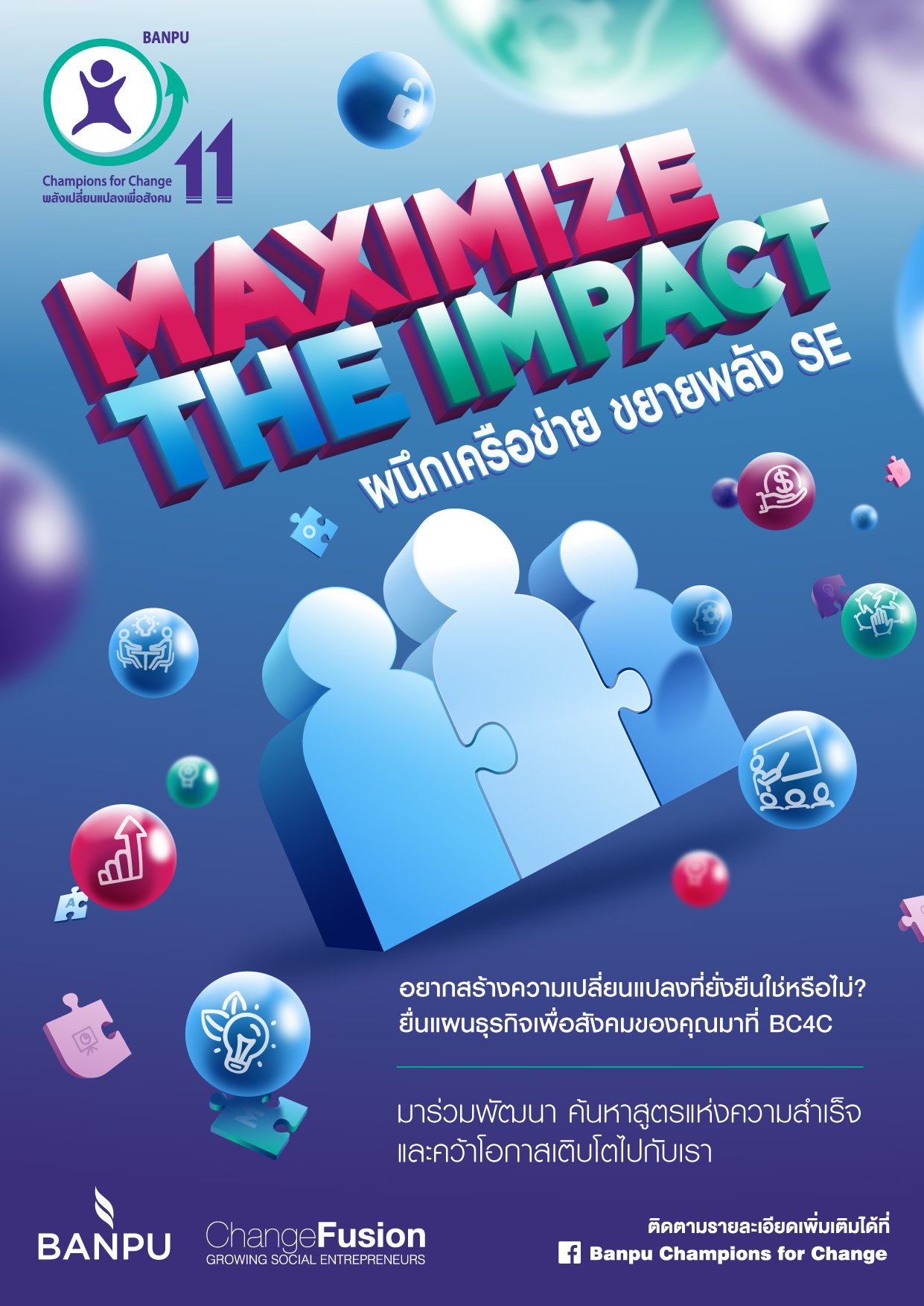 บริษัท บ้านปู จำกัด (มหาชน) ผู้นำธุรกิจด้านพลังงานที่หลากหลายในระดับนานาชาติ สานต่อความมุ่งมั่นในการพัฒนาสังคมอย่างยั่งยืน ภายใต้ความร่วมมือกับ ChangeFusion องค์กรไม่แสวงผลกำไรภายใต้มูลนิธิบูรณะชนบทแห่งประเทศไทยในพระบรมราชูปถัมภ์ เปิดโครงการบ่มเพาะและสนับสนุนผู้ประกอบกิจการเพื่อสังคมรุ่นใหม่ “โครงการพลังเปลี่ยนแปลงเพื่อสังคม (Banpu Champions for Change) หรือ BC4C” รุ่นที่ 11 เพื่อเฟ้นหาผู้ประกอบการหน้าใหม่ทั้งแบบรายบุคคลหรือรวมกลุ่มไม่เกิน 4 คน อายุระหว่าง 20-35 ปี จากทั่วประเทศ โดยเปิดรับสมัครตั้งแต่วันนี้ถึง 10 เมษายนนี้ ผู้ที่สนใจสามารถดูรายละเอียดเพิ่มเติมได้ที่ เฟซบุ๊ก Banpu Champions for Change
