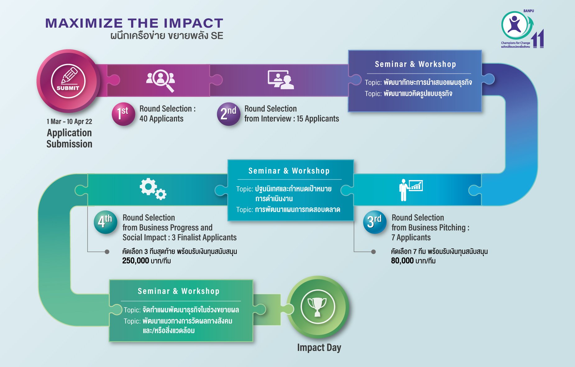 โครงการ BC4C รุ่นที่ 11 จะคัดเลือกผู้สมัครในรอบแรกทั้งหมด 40 ทีมเข้าสู่การสัมภาษณ์กับคณะกรรมการผู้ทรงคุณวุฒิและคัดเหลือ 15 ทีมในรอบที่ 2 ที่จะได้เข้าร่วมเวิร์คช็อปการพัฒนาแนวคิดรูปแบบธุรกิจและพัฒนาทักษะการนำเสนอแผนธุรกิจ ก่อนจะเข้าสู่การคัดเลือกในรอบที่ 3 ผ่านการเสนอแผนธุรกิจ ซึ่งทีมที่ผ่านการคัดเลือกในรอบนี้ทั้ง 7 ทีมจะได้รับเงินสนับสนุนทีมละ 80,000 บาทเพื่อเริ่มต้นพัฒนาธุรกิจและทดสอบตลาดจริง โดย 3 ทีมที่โดดเด่นในเชิงธุรกิจและการสร้างผลลัพธ์ทางสังคมได้ดีที่สุด จะได้รับคัดเลือกเพื่อรับทุนสนับสนุนให้ดำเนินกิจการต่อเนื่องในระยะยาวอีกทีมละ 250,000 บาท รวมทุนสนับสนุนตลอดโครงการฯ มูลค่ากว่า 1.3 ล้านบาท