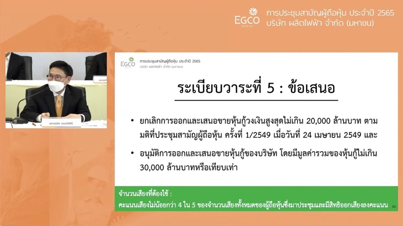 บริษัท ผลิตไฟฟ้า จำกัด (มหาชน) หรือ เอ็กโก กรุ๊ป จัดการประชุมสามัญผู้ถือหุ้นประจำปี 2565 ผ่านสื่ออิเล็กทรอนิกส์ (E-AGM) เมื่อวันอังคารที่ 19 เมษายน 2565 เวลา 14.00 น. เพื่อให้ผู้ถือหุ้นรับทราบการดำเนินธุรกิจของบริษัทฯ ตลอดจนมีส่วนร่วมในการขับเคลื่อนและติดตามการบริหารจัดการของคณะกรรมการและฝ่ายบริหาร ภายใต้รูปแบบการประชุมที่สอดคล้องกับมาตรการป้องกันการแพร่ระบาดของโควิด-19