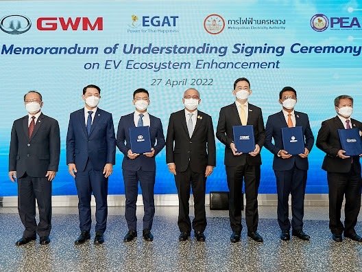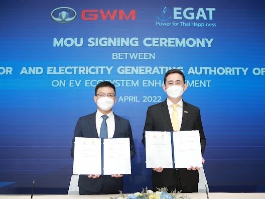 พิธีลงนามบันทึกข้อตกลงความร่วมมือจัดขึ้นเมื่อวันที่ 27 เมษายน 2565 ซึ่งนายสุพัฒนพงษ์ พันธ์มีเชาว์ รองนายกรัฐมนตรี และรัฐมนตรีว่าการกระทรวงพลังงาน ได้ให้เกียรติเป็นประธานในพิธี โดยมี มร. ไมเคิล ฉง รองประธาน เกรท วอลล์ มอเตอร์ (ประเทศไทย) นายบุญญนิตย์ วงศ์รักมิตร ผู้ว่าการการไฟฟ้าฝ่ายผลิตแห่งประเทศไทย นายวิลาศ เฉลยสัตย์ ผู้ว่าการการไฟฟ้านครหลวง และนายศุภชัย เอกอุ่น ผู้ว่าการการไฟฟ้าส่วนภูมิภาค เป็นผู้ลงนาม ณ GWM Experience Center ไอคอนสยาม พร้อมด้วยทีมผู้บริหารระดับสูงจาก เกรท วอลล์ มอเตอร์ ได้แก่ นายณรงค์ สีตลายน กรรมการผู้จัดการ และนายครรชิต ไชยสุโพธิ์ รองประธาน ฝ่ายกิจการองค์กรและรัฐกิจสัมพันธ์ เกรท วอลล์ มอเตอร์ (ประเทศไทย) ร่วมเป็นสักขีพยานในพิธี