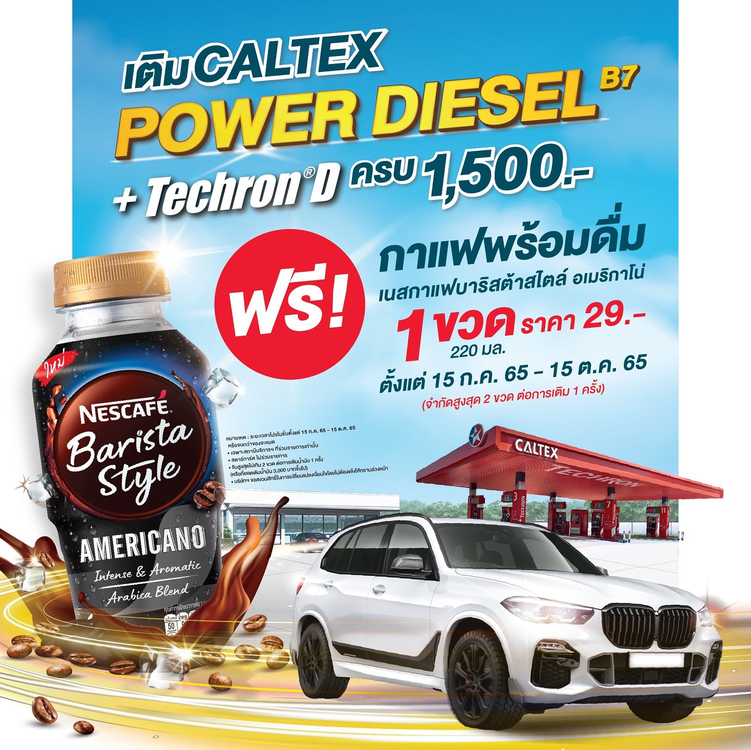 บริษัท เชฟรอน (ไทย) จำกัด ผู้ผลิตและจำหน่ายผลิตภัณฑ์คาลเท็กซ์ จัดโปรโมชั่นเอาใจสายดีเซล มอบสิทธิพิเศษเฉพาะลูกค้าสถานีบริการน้ำมันคาลเท็กซ์สาขาที่ร่วมรายการ เพียงเติมน้ำมัน คาลเท็กซ์ พาวเวอร์ ดีเซล บี 7 ครบทุก 1,500 บาทต่อใบเสร็จ รับฟรีทันที เนสกาแฟ บาริสต้าสไตล์ อเมริกาโน่ กาแฟพร้อมดื่มชั้นดีที่มีรสชาติกาแฟเต็ม ๆ เข้มข้นกลิ่นหอมกำลังดี ขนาด 220 มล. จำนวน 1 ขวด มูลค่า 29 บาท (จำกัดการรับสูงสุดไม่เกิน 2 ขวด ต่อ 1 ใบเสร็จ (กรณียอดเติมน้ำมัน 3,000 บาทขึ้นไป)) ตั้งแต่วันที่ 15 กรกฎาคม 2565 จนถึงวันที่ 15 ตุลาคม 2565 หรือจนกว่าสินค้าจะหมด ทั้งนี้ ข้อกำหนดและเงื่อนไขเป็นไปตามที่บริษัทฯ กำหนด