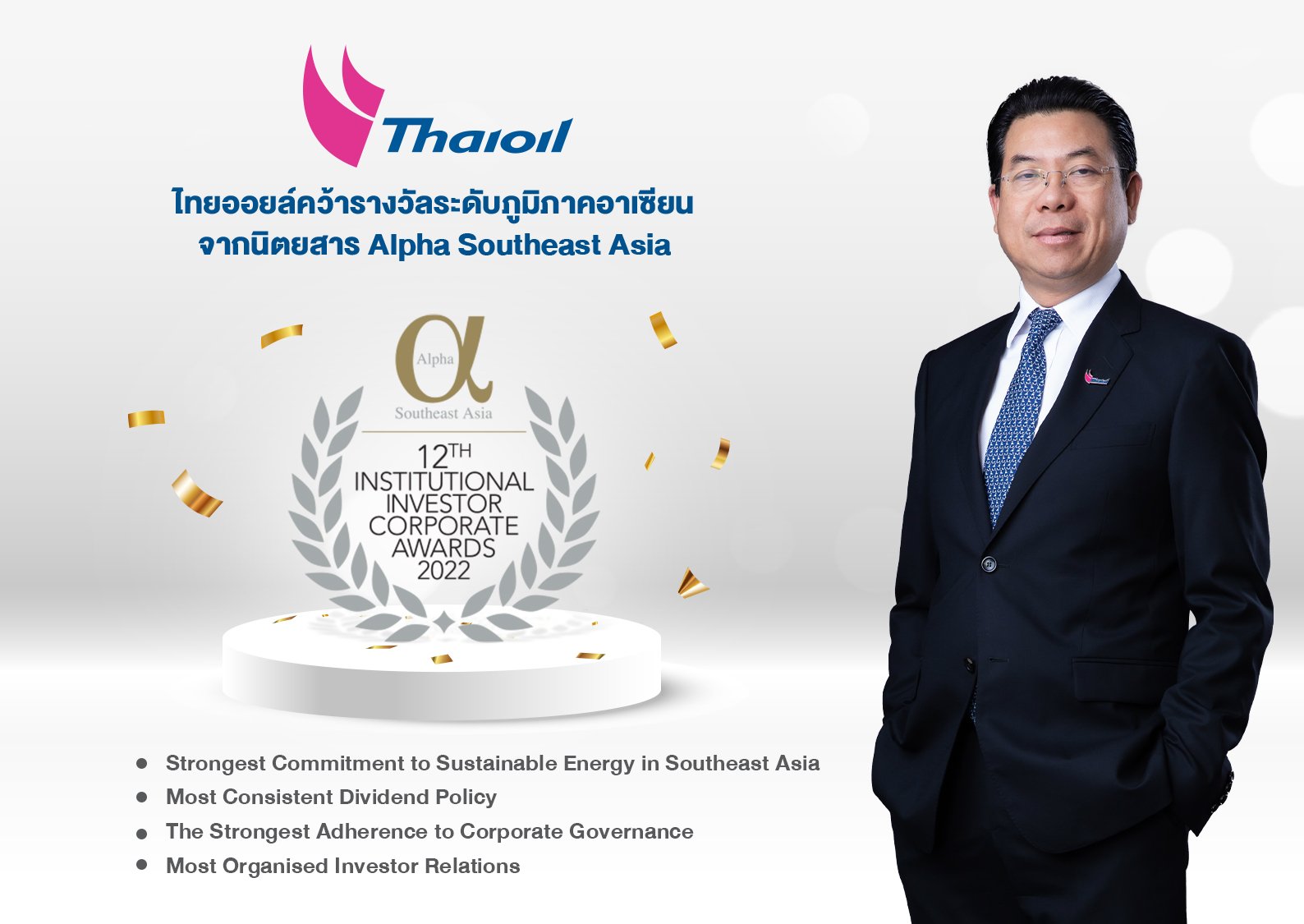 บริษัท ไทยออยล์ จำกัด (มหาชน) รับมอบรางวัลชนะเลิศระดับภูมิภาคอาเซียน “พันธกิจสู่ความยั่งยืนด้านพลังงาน” (Strongest Commitment to Sustainable Energy in Southeast Asia) เป็นปีที่ 10 จากนิตยสาร Alpha Southeast Asia ซึ่งเป็นนิตยสารชั้นนำด้านการลงทุน สถาบัน การธนาคารและตลาดทุนของภูมิภาคเอเชียตะวันออกเฉียงใต้