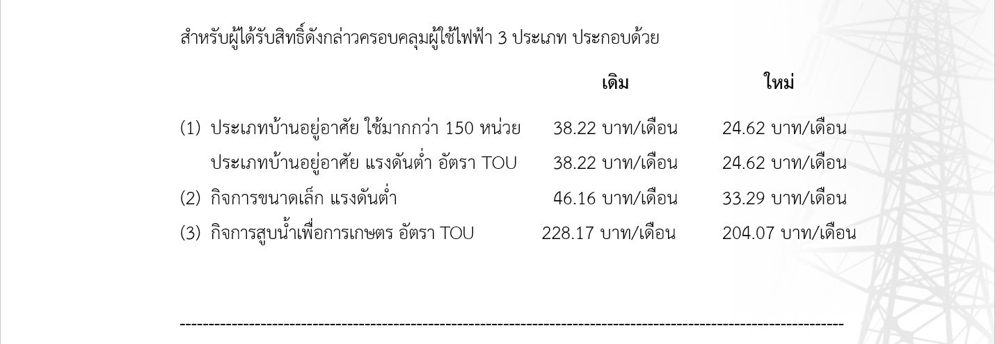 “ในการประชุมครั้งที่ 51/2565 (ครั้งที่ 818) เมื่อวันที่ 9 พฤศจิกายน 2565 คณะกรรมการกำกับกิจการพลังงาน (กกพ.) ได้พิจารณาทบทวนอัตราค่าบริการรายเดือนที่ผ่านมา หลังจากได้มีการเปิดรับฟังความคิดเห็นจากผู้มีส่วนได้ส่วนเสีย ในระหว่างวันที่ 3 - 17 ต.ค. 2565 แล้ว มีมติเห็นชอบให้มีการปรับอัตราค่าบริการรายเดือนตามต้นทุนการจดหน่วยพิมพ์บิลที่การไฟฟ้าสามารถลดได้จริงเพื่อให้มีความเหมาะสม นอกจากจะเป็นธรรมต่อผู้ใช้ไฟฟ้าแล้วยังสามารถช่วยลดค่าครองชีพได้อีกทางหนึ่งด้วย”