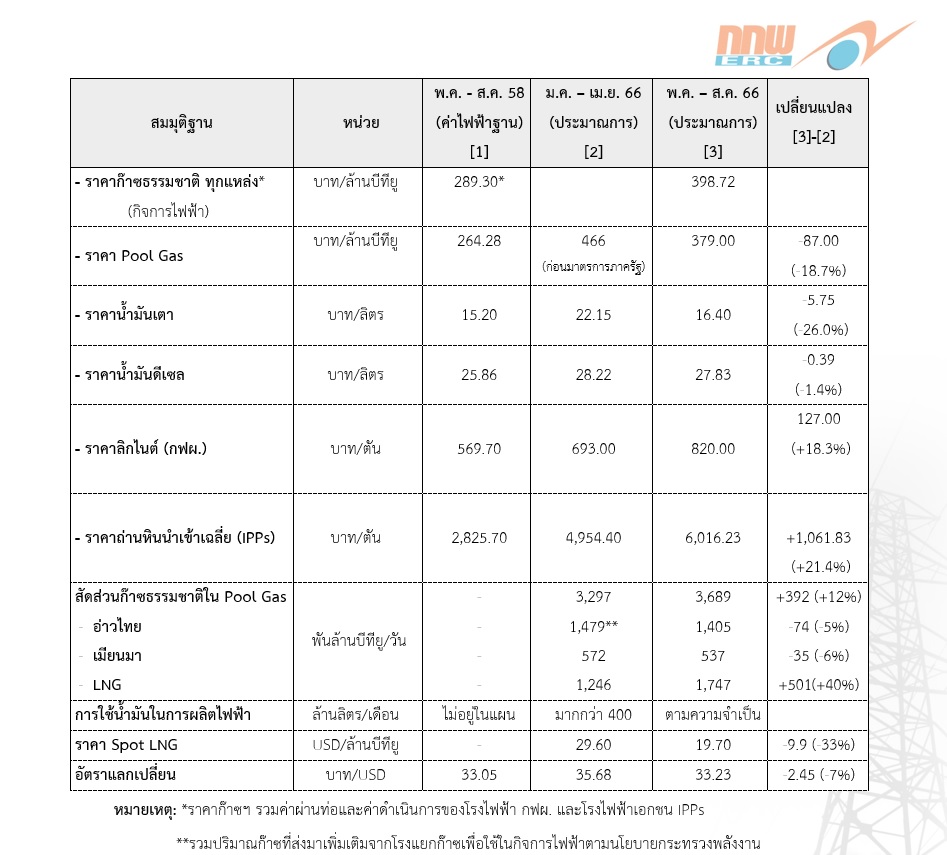 สรุปสมมุติฐานที่ใช้การประมาณการค่าเอฟทีในรอบคำนวณเดือน พ.ค. – ส.ค. 2566 เทียบกับการคำนวณในปีฐาน พ.ค. – ส.ค. 2558 และรอบประมาณการค่าเอฟทีเดือน ม.ค. – เม.ย. 2566 แสดงในตารางดังนี้