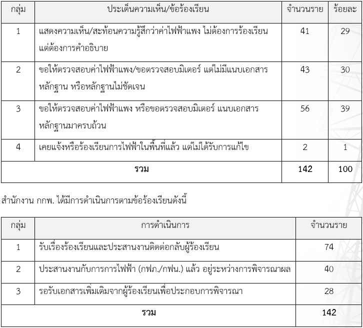 สำนักงานคณะกรรมการกำกับกิจการพลังงาน (สำนักงาน กกพ.) เปิดเผยว่า ภายหลังจากที่สำนักงาน กกพ. ได้ประชาสัมพันธ์ไปยังผู้ใช้ไฟฟ้าที่พบปัญหาหรือข้อสงสัยว่าค่าไฟฟ้าที่เรียกเก็บจากการไฟฟ้าฝ่ายจำหน่ายไม่ถูกต้อง หรือมีข้อสังสัย ปัญหาเกี่ยวกับการได้รับบริการ ซึ่งสามารถร้องเรียนผ่านทางสำนักงาน กกพ. ส่วนกลาง สำนักงาน กกพ.ประจำเขตพื้นที่ และคณะกรรมการผู้ใช้พลังงานประจำเขต (คพข.) ในช่วงระหว่างวันที่ 26 เมษายน 2566 – วันที่ 3 พฤษภาคม 2566 พบว่า มีผู้ยื่นเรื่องร้องเรียนเข้ามายังสำนักงานเพื่อให้ตรวจสอบการเรียกเก็บค่าไฟฟ้า เป็นจำนวนรวม 142 ราย ทั้งนี้ สามารถสรุปประเด็นประเภทการร้องเรียน และจำนวนเรื่องการร้องเรียนเกี่ยวกับค่าไฟฟ้า ได้ดังนี้