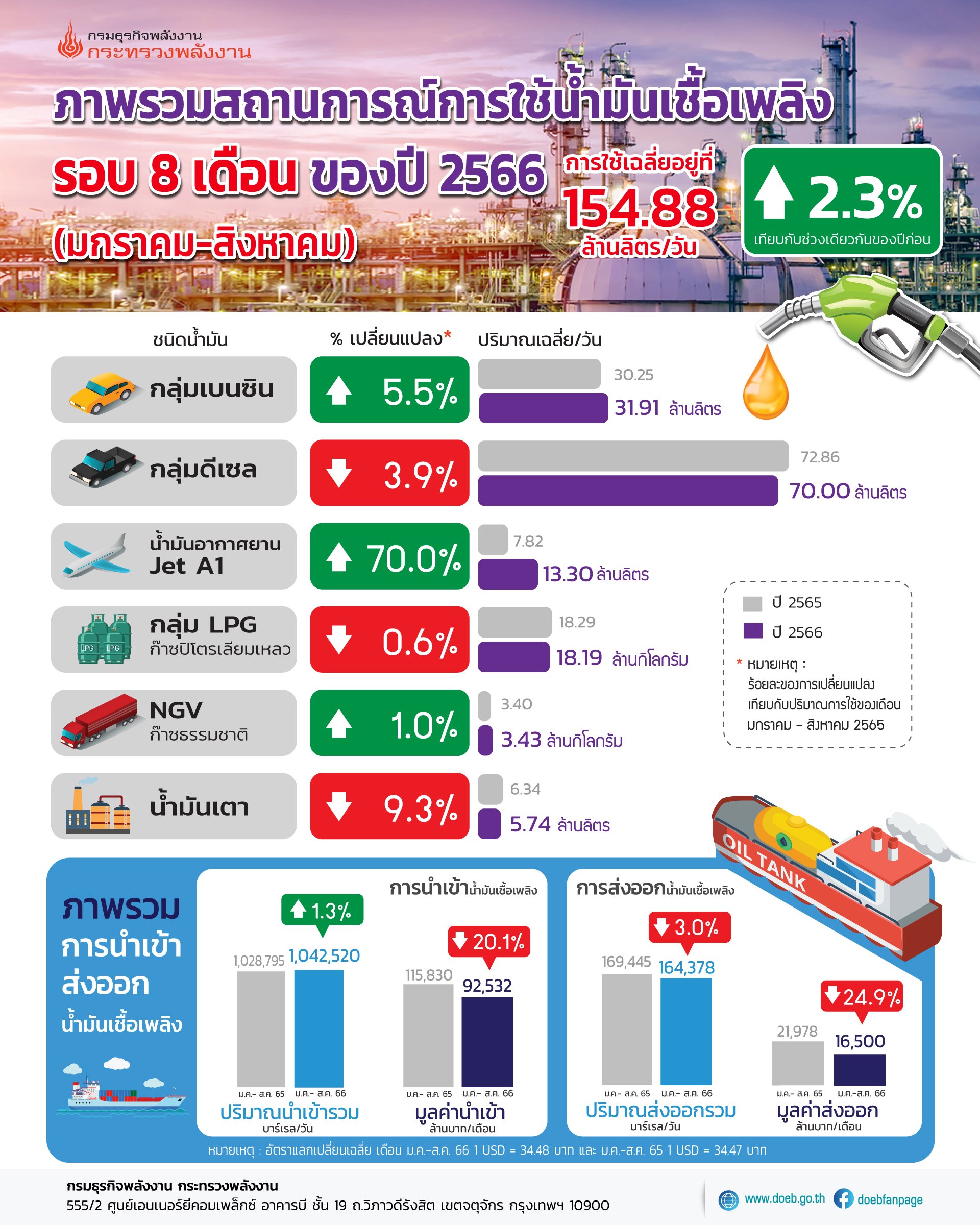 นางสาวนันธิกา ทังสุพานิช อธิบดีกรมธุรกิจพลังงาน เผยภาพรวมการใช้น้ำมันเชื้อเพลิงเฉลี่ยเดือนมกราคม – สิงหาคม 2566 อยู่ที่ 154.88 ล้านลิตร/วัน เพิ่มขึ้นเมื่อเทียบกับช่วงเดียวกันของปีก่อนร้อยละ 2.3 โดยการใช้น้ำมันกลุ่มเบนซินเพิ่มขึ้นร้อยละ 5.5 น้ำมันอากาศยานเชิงพาณิชย์ (Jet A1) เพิ่มขึ้นร้อยละ 70.0 และการใช้ NGV เพิ่มขึ้นร้อยละ 1.0 ขณะที่ น้ำมันกลุ่มดีเซล น้ำมันเตาและ LPG มีการใช้ลดลงร้อยละ 3.9 ร้อยละ 9.3 และร้อยละ 0.6 ตามลำดับ