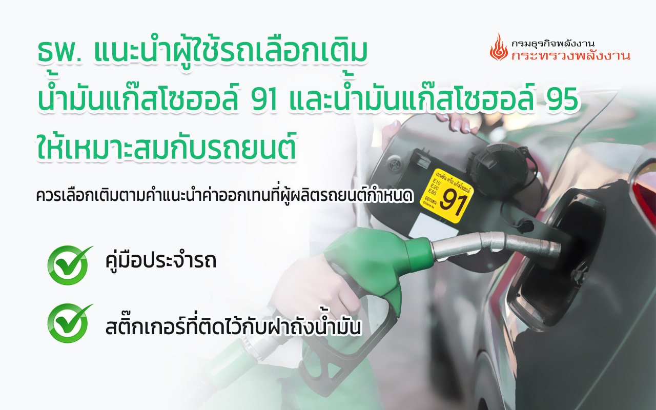 ธพ. แนะนำผู้ใช้รถเลือกเติมน้ำมันแก๊สโซฮอล์ 91 และน้ำมันแก๊สโซฮอล์ 95 ให้เหมาะสมกับรถยนต์