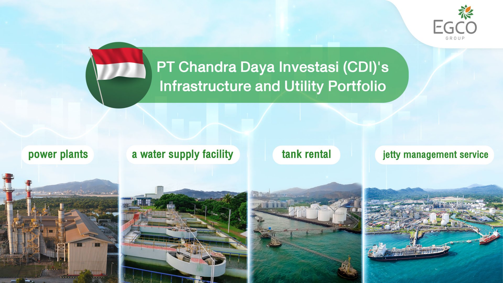 บริษัท ผลิตไฟฟ้า จำกัด (มหาชน) หรือ เอ็กโก กรุ๊ป ตอกย้ำรากฐานอันแข็งแกร่งในธุรกิจไฟฟ้าและต่อยอดธุรกิจโครงสร้างพื้นฐานในภูมิภาคอาเซียน ด้วยการซื้อหุ้น 30% ในบริษัทโครงสร้างพื้นฐานและสาธารณูปโภค ในเครือบริษัท พีที จันทรา อศรี ปิโตรเคมีคอล ทีบีเค กรุ๊ป (CAP) ผู้นำในธุรกิจเคมีและโครงสร้างพื้นฐานในประเทศอินโดนีเซีย ด้วยมูลค่าการลงทุน 194 ล้านเหรียญสหรัฐ (ประมาณ 6,800 ล้านบาท) ซึ่งเปิดโอกาสให้เอ็กโก กรุ๊ป ร่วมเป็นเจ้าของโครงสร้างพื้นฐานและสาธารณูปโภคที่มีศักยภาพในประเทศอินโดนีเซีย ประกอบด้วยโรงไฟฟ้าเชื้อเพลิงก๊าซธรรมชาติ 2 แห่ง โรงงานผลิตและบำบัดน้ำ รวมทั้งท่าเทียบเรือและคลังเก็บผลิตภัณฑ์เคมี