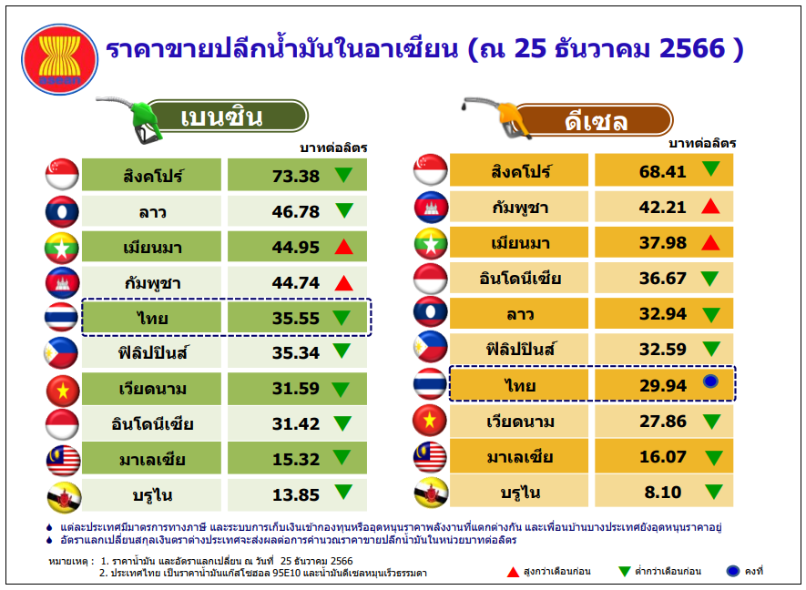 “สำหรับราคาขายปลีกน้ำมันเบนซินและดีเซลของประเทศไทยและต่างประเทศ ณ วันที่ 25 ธันวาคม 2566 พบว่า ราคาขายปลีกน้ำมันเบนซิน ประเทศสิงคโปร์มีระดับสูงสุดในกลุ่มอาเซียน อยู่ที่ระดับ 73.38 บาทต่อลิตร ขณะที่ประเทศไทยอยู่ในอันดับ 5 ของกลุ่มอาเซียน อยู่ที่ระดับ 35.55 บาทต่อลิตร ส่วนราคาขายปลีกน้ำมันดีเซลนั้น ประเทศสิงคโปร์ มีระดับสูงสุดในกลุ่มอาเซียน อยู่ที่ระดับ 68.41 บาทต่อลิตร ขณะที่ประเทศไทยอยู่ในอันดับ 7 ของกลุ่มอาเซียน อยู่ที่ระดับ 29.94 บาทต่อลิตร อย่างไรก็ตาม ราคาขายปลีกน้ำมันสำเร็จรูปในแต่ละประเทศจะแตกต่างกัน ขึ้นอยู่กับโครงสร้าง มาตรการด้านภาษี และนโยบายการชดเชยราคาน้ำมันของประเทศนั้น ทั้งนี้ สนพ. จะติดตามสถานการณ์ราคาน้ำมันตลาดโลกอย่างต่อเนื่อง เพื่อเตรียมความพร้อมรองรับสถานการณ์ฉุกเฉินด้านพลังงานที่อาจจะเกิดขึ้น เพื่อสามารถบรรเทาผลกระทบด้านราคาพลังงานต่อประชาชนในระยะต่อไป” ผอ.สนพ. กล่าว