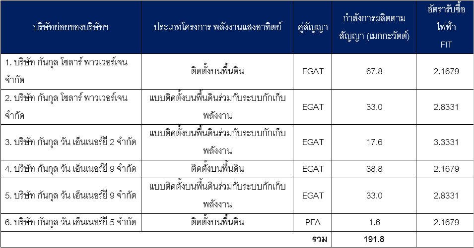ทั้งนี้เมื่อวันที่ 28 กุมภาพันธ์ 2567 กลุ่มบริษัทย่อยที่บริษัทฯ ถือหุ้น 100% ได้เข้าลงนามในสัญญาซื้อขายไฟฟ้า (“PPA”) กับการไฟฟ้าฝ่ายผลิต (“กฟผ”) แบ่งเป็น โครงการพลังงานแสงอาทิตย์แบบติดตั้งบนพื้นดิน (Solar Farm) จำนวน 2 โครงการ กำลังผลิตรวม 106.6 เมกะวัตต์ และ พลังงานแสงอาทิตย์แบบติดตั้งบนพื้นดินร่วมกับระบบกักเก็บพลังงาน (Battery Energy Storage System : BESS) อีก จำนวน 3 โครงการ กำลังผลิตรวม 83.6 เมกะวัตต์ และเข้าลงนามกับการไฟฟ้าส่วนภูมิภาค (กฟภ.) เมื่อวันที่ 22 ธันวาคม 2566 จำนวน 1 โครงการในรูปแบบพลังงานแสงอาทิตย์แบบติดตั้งบนพื้นดิน (Solar Farm) กำลังการผลิตรวม 1.6 เมกกะวัตต์ ส่งผลให้ขนาดกำลังการผลิตไฟฟ้าใหม่รวมเป็น 621.4 เมกะวัตต์ สัญญาระยะยาว 25 ปี คาดทยอยเปิดดำเนินการเชิงพาณิชย์ (COD) ในปี 2571-2573 หนุนให้บริษัทมีกำลังการผลิตไฟฟ้าตามสัญญาโดยรวมสูงขึ้นเป็น 1,236.95 เมกะวัตต์ จากเดิม 615.55 เมกะวัตต์ เติบโตเพิ่มขึ้น 100% ซึ่งรายละเอียดของแต่ละโครงการมีดังต่อไปนี้