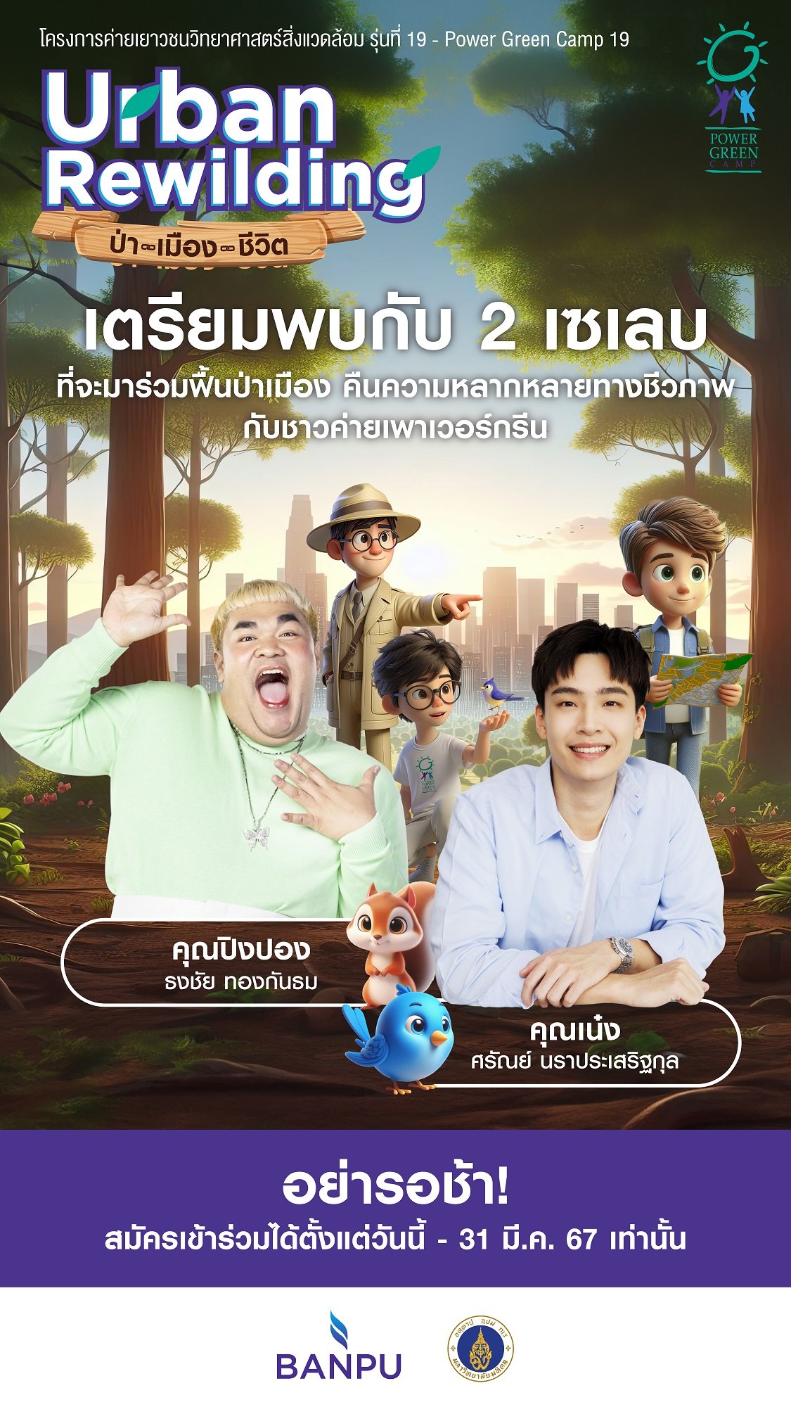 บ้านปู ร่วมกับมหิดล เชิญชวนน้อง ๆ ระดับมัธยมปลายและ ปวช.ทั่วประเทศ สมัครเข้าร่วมค่ายเยาวชนวิทยาศาสตร์สิ่งแวดล้อม (Power Green Camp) ครั้งที่ 19 ภายใต้แนวคิด “Urban Rewilding: ป่า - เมือง - ชีวิต” เชื่อมโยงป่ามาสู่เมือง เชื่อมทุกชีวิตให้ใกล้ชิดธรรมชาติ โดยในปีนี้มี 2 เซเลบ อย่าง “เน๋ง-ศรัณย์ นราประเสริฐกุล” และ “ปิงปอง-ธงชัย ทองกันธม” ที่จะมาร่วมฟื้นป่าเมือง คืนความหลากหลายทางชีวภาพไปกับชาวค่ายฯ ศึกษาความเชื่อมโยงระหว่าง ‘ป่าธรรมชาติ’ และ ‘ป่าในเมือง’ เพื่อนำองค์ความรู้ไปต่อยอดแนวคิดในการออกแบบและพัฒนาพื้นที่ป่าในเมืองอย่างเป็นระบบ ซึ่งนอกจากจะเป็นการช่วยฟื้นฟูความหลากหลายทางชีวภาพทั้งชนิดพันธุ์พืชและสัตว์แล้ว ก็ยังเป็นการช่วยเพิ่มพื้นที่สีเขียว หัวใจสำคัญของเมืองยั่งยืนที่มีส่วนช่วยยกระดับคุณภาพชีวิตให้แก่คนเมืองอีกด้วย งานนี้น้องคนไหนอยากร่วมเรียนรู้ และเป็นส่วนหนึ่งกับค่ายในปีนี้ รีบสมัครให้ไว ผ่านทางเว็บไซต์ www.powergreencamp.com เปิดรับสมัครถึงวันที่ 31 มีนาคมนี้เท่านั้น