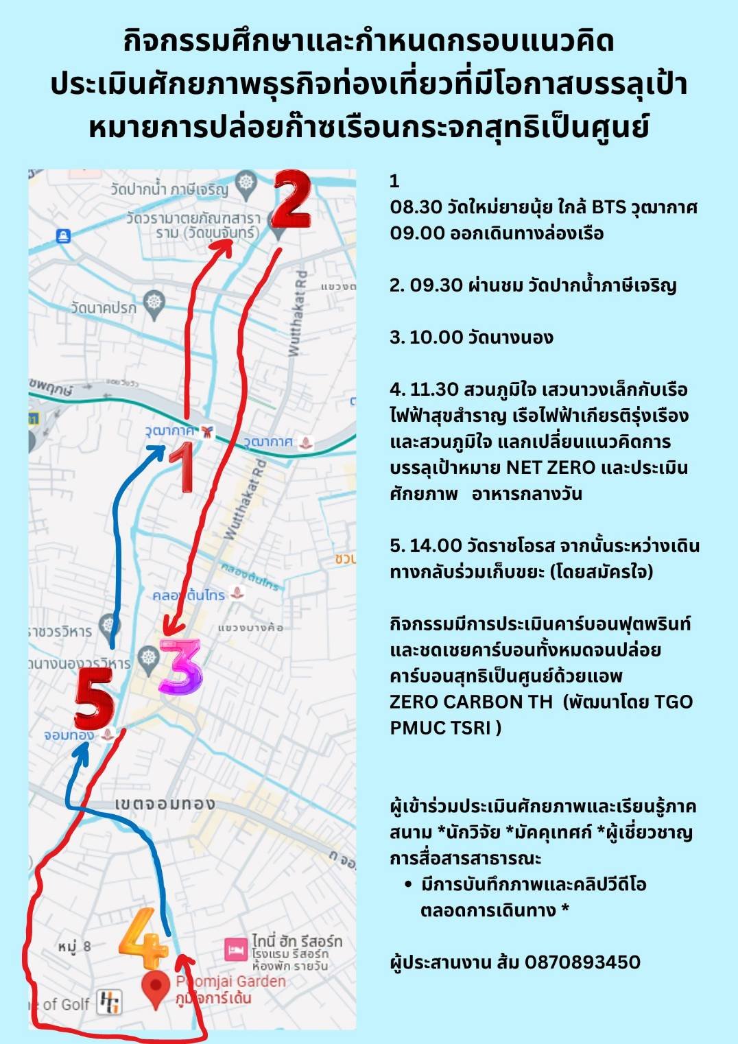ล่าสุดเมื่อวันที่ 29 มิถุนายนที่ผ่านมา ได้มีการนำสื่อมวลชนร่วมทริปทดลองใช้แอปพลิเคชัน Zero Carbon เพื่อประเมินคาร์บอนฟุตพรินท์และประเมินศักยภาพของธุรกิจท่องเที่ยวที่มีโอกาสการปล่อยคาร์บอนสุทธิเป็นศูนย์ ล่องคลองฝั่งธนบุรี ด้วยเรือไฟฟ้าทั้งแบบไฮบริดและเรือไฟฟ้า100% ภายใต้ชื่อ “Field Trip EV Tourism Boat – PoomJai Garden” ในเส้นทางวัดใหม่ยายนุ้ย – ผ่านชมวัดปากน้ำภาษีเจริญ - วัดนางนอง -การเสวนาวงเล็กกับเรือไฟฟ้าสุขสำราญ เรือไฟฟ้าเกียรติ์รุ่งเรือง(สิริณวารี) และสวนภูมิใจการ์เด้น ไหว้พระที่วัดราชโอรส ปิดท้ายด้วยการร่วมช้อนขยะในคลองด้วยกัน โดยมีนายนิพัทธ์พงษ์ ชวนชื่น ผู้ให้บริการนำเที่ยวและนักวิจัยด้านการจัดการก๊าซเรือนกระจกภาคท่องเที่ยวทุน บพข. ในสังกัดสมาคมไทยท่องเที่ยวเชิงอนุรักษ์และผจญภัย (สทอ.) อธิบายให้สื่อมวลชนที่ร่วมกิจกรรมฟังถึงวิธีเก็บข้อมูล