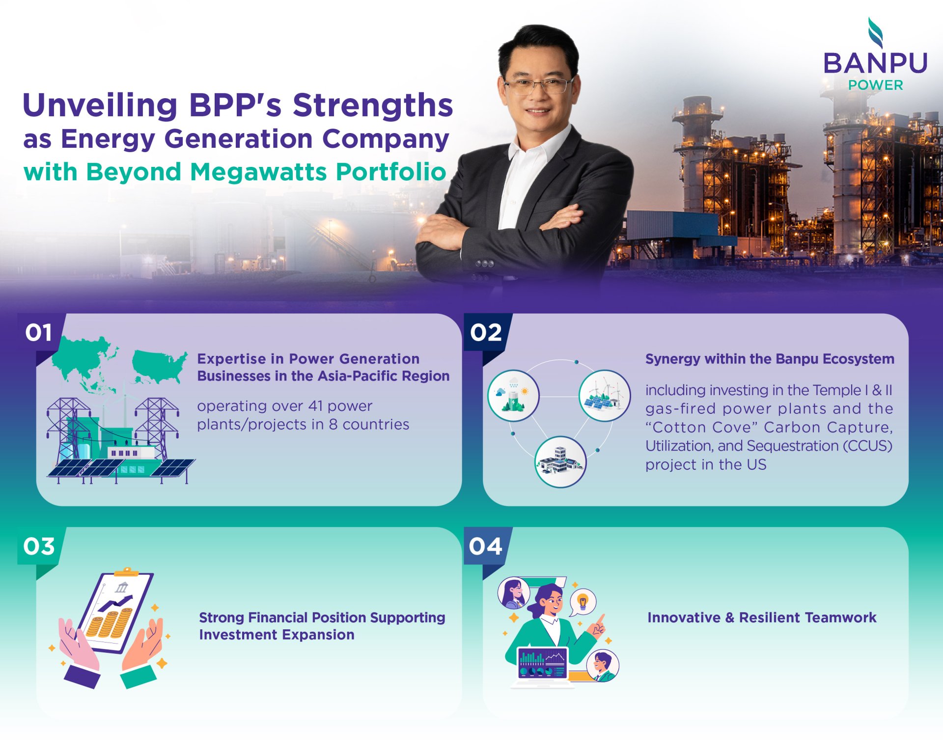 • ความสามารถในการผสานพลังร่วมกับกลุ่มบ้านปู (Synergy within the Banpu Ecosystem) BPP ซึ่งอยู่ในกลุ่มธุรกิจผลิตพลังงานของบ้านปู สามารถเสริมความแข็งแกร่งในธุรกิจโดยอาศัยพลังร่วมจากกลุ่มธุรกิจแหล่งพลังงาน และกลุ่มธุรกิจเทคโนโลยีพลังงาน เช่น 1) การต่อยอดธุรกิจผลิตไฟฟ้าโดยลงทุนในธุรกิจโรงไฟฟ้าก๊าซธรรมชาติ Temple I & II ในรัฐเท็กซัส สหรัฐอเมริกา หลังจากที่บ้านปูได้ดำเนินธุรกิจแหล่งก๊าซธรรมชาติบาร์เนตต์ที่ตั้งอยู่ในรัฐเท็กซัส ผ่านบริษัท BKV ซึ่งเป็นบริษัทลูกของบ้านปู 2) การที่ BPP ลงทุนในโครงการโรงไฟฟ้าพลังงานแสงอาทิตย์ Ponder Solar ที่ตั้งอยู่ในแหล่งก๊าซธรรมชาติบาร์เนตต์ นับเป็นการเริ่มต้นธุรกิจพลังงานหมุนเวียนในสหรัฐฯ ของ BPP เป็นครั้งแรก 3) การร่วมลงทุนเพื่อพัฒนาโครงการดักจับและกักเก็บก๊าซคาร์บอนไดออกไซด์ (Carbon Capture, Utilization and Sequestration: CCUS) “Cotton Cove” ในสหรัฐฯ ร่วมกับ BKV ทำให้ BPP เป็นหนึ่งในบริษัทที่มีความก้าวหน้าในเรื่องการลดการปล่อยก๊าซคาร์บอนไดออกไซด์ (Decarbonization) และ 4) การแบ่งปันองค์ความรู้กับบ้านปูซึ่งมีความเชี่ยวชาญในธุรกิจเทคโนโลยีพลังงานเพื่อพัฒนาธุรกิจที่เกี่ยวเนื่องกับพลังงานสะอาด เช่น การศึกษาความเป็นไปได้ในการพัฒนาโครงการแบตเตอรี่และระบบกักเก็บพลังงาน (Battery & Energy Storage System: BESS) ในพื้นที่โรงไฟฟ้า Temple I & II และธุรกิจที่เกี่ยวเนื่องกับพลังงานอื่น ๆ ในอนาคต