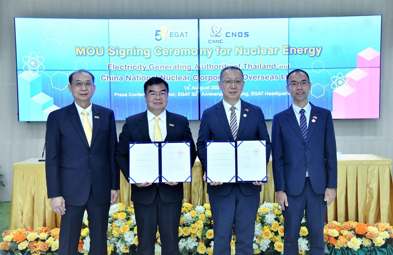 เมื่อวันที่ 14 สิงหาคม 2567 นายทิเดช เอี่ยมสาย รองผู้ว่าการพัฒนาโรงไฟฟ้าและพลังงานหมุนเวียน การไฟฟ้าฝ่ายผลิตแห่งประเทศไทย (กฟผ.) และ Mr.Qiao Gang, Vice President of China National Nuclear Corporation Overseas Ltd. (CNOS) จากสาธารณรัฐประชาชนจีน ร่วมลงนามบันทึกข้อตกลงความร่วมมือ (MOU) ด้านเทคโนโลยีโรงไฟฟ้าพลังงานนิวเคลียร์ มุ่งส่งเสริมพลังงานสะอาด สร้างความมั่นคงและความยั่งยืนด้านการจัดหาพลังงาน ณ ห้อง Press Conference ชั้น 3 อาคาร 50 ปี กฟผ. สำนักงานใหญ่ กฟผ.