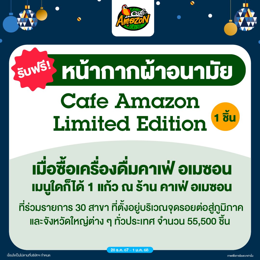 • พิเศษสำหรับลูกค้า คาเฟ่ อเมซอน เมื่อซื้อเครื่องดื่มคาเฟ่ อเมซอน เมนูใดก็ได้ 1 แก้วรับฟรี หน้ากากผ้าอนามัย Café Amazon Limited Edition1 ชิ้น ณ ร้านคาเฟ่ อเมซอน ที่ร่วมรายการ 30 สาขา ที่ตั้งอยู่บริเวณจุดรอยต่อสู่ภูมิภาคและจังหวัดใหญ่ต่าง ๆ ทั่วประเทศ ระหว่างวันที่ 28 ธันวาคม 2567 - 1 มกราคม 2568