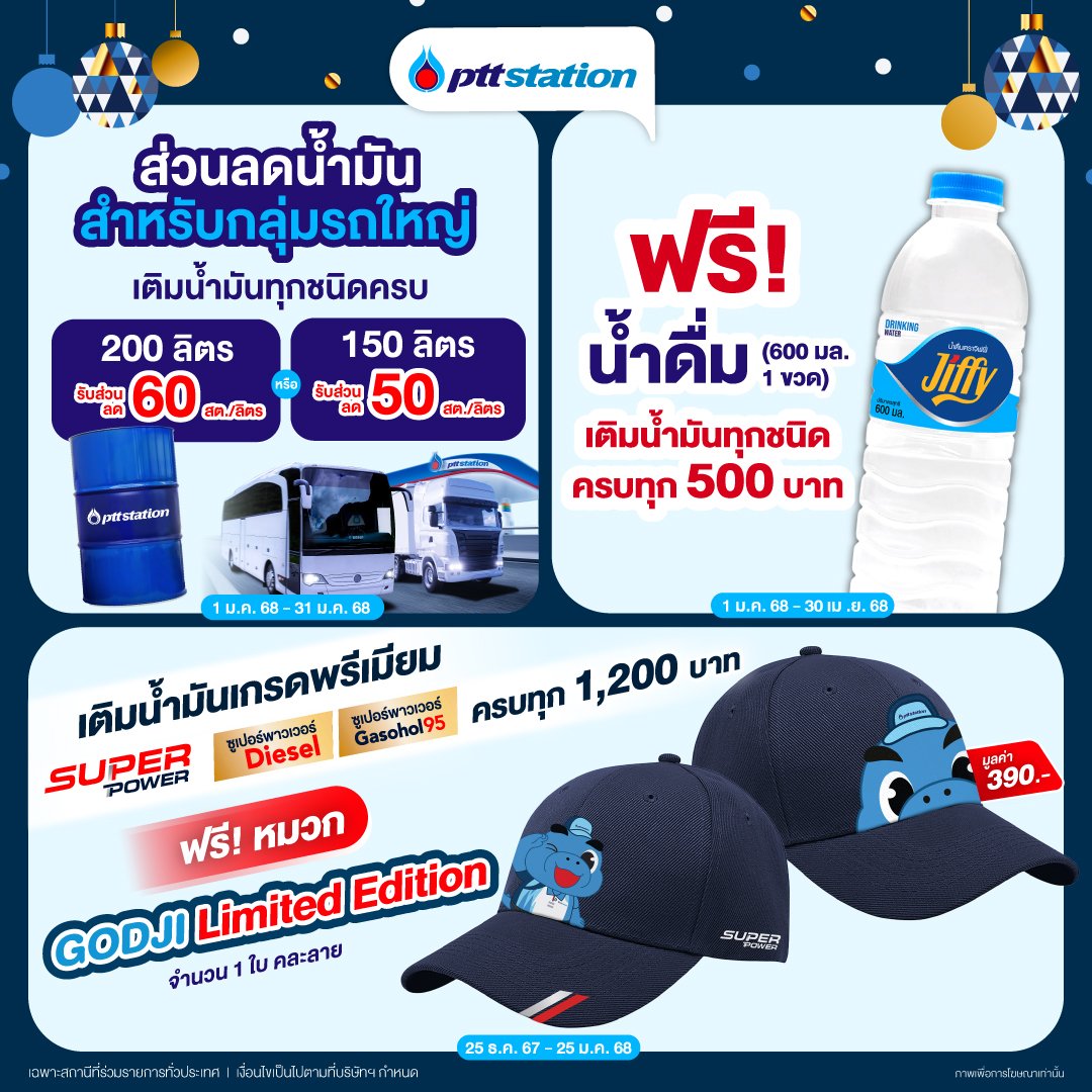 • สถานีบริการ พีทีที สเตชั่น จัดโปรโมชันพิเศษ เมื่อเติมน้ำมันทุกชนิดครบ 500 บาท รับฟรี น้ำดื่ม 1 ขวด ตั้งแต่วันที่ 1 มกราคม - 30 เมษายน 2568 และพิเศษสำหรับลูกค้าที่เติมน้ำมัน Super Power ครบ 1,200 บาท รับฟรี หมวก GODJI Limited Edition 1 ใบ ตั้งแต่วันที่ 25 ธันวาคม 2567- 25 มกราคม 2568 รวมทั้ง เมื่อเติมน้ำมันทุกชนิดครบ 100 บาทขึ้นไป รับฟรี ประกันอุบัติเหตุคุ้มครองสูงสุด 100,000 บาท ตั้งแต่วันที่ 25 ธันวาคม 2567 - 3 มกราคม 2568 นอกจากนี้ สำหรับกลุ่มรถใหญ่ เมื่อเติมน้ำมันทุกชนิดครบ 150 ลิตร รับส่วนลด 0.50 บาทต่อลิตร หรือ เมื่อเติมครบ 200 ลิตร รับส่วนลด 0.60 บาทต่อลิตร ตั้งแต่วันที่ 1 -31 มกราคม 2568