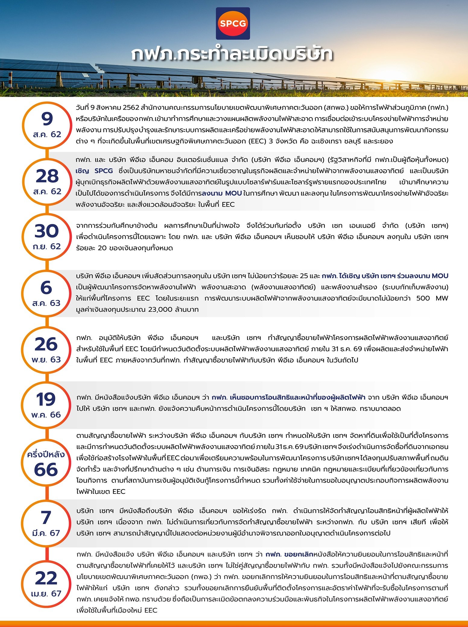 ทั้งนี้ บริษัท เอสพีซีจีฯ ขอแสดงจุดยืนว่าได้ร่วมดำเนินโครงการฯ ดังกล่าวอย่างโปร่งใส สอดคล้องกับขั้นตอนตามกฎหมาย บนพื้นฐานของความระมัดรอบคอบและสุจริตมาตลอด จึงต้องการขอความเป็นธรรมและปกป้องผลประโยชน์ของผู้ถือหุ้น โดยที่มาของการยื่นคำฟ้องต่อศาลปกครองกลางครั้งนี้ มีจุดเริ่มต้นจากเมื่อวันที่ 9 สิงหาคม 2562 เมื่อสำนักงานคณะกรรมการนโยบายเขตพัฒนาพิเศษภาคตะวันออก (สกพอ.) ได้ให้กฟภ. หรือบริษัทในเครือของ กฟภ. ศึกษาและวางแผนผลิตพลังงานไฟฟ้าสะอาดการเชื่อมต่อ เข้าระบบโครงข่ายไฟฟ้า การจำหน่ายพลังงาน การปรับปรุง บำรุง และรักษาระบบการผลิตและเครือข่ายพลังงานไฟฟ้าสะอาด ให้สามารถใช้สนับสนุนการพัฒนากิจกรรมต่างๆ ที่จะเกิดขึ้นในพื้นที่เขตเศรษฐกิจพิเศษภาคตะวันออก (EEC) โดย กฟภ.ได้มอบหมายให้บริษัท พีอีเอ เอ็นคอม อินเตอร์เนชั่นแนล จำกัด (บริษัท พีอีเอ เอ็นคอมฯ) ซึ่งเป็นบริษัทจำกัดที่ กฟภ. ถือหุ้นทั้งหมด เป็นผู้ผลิตพลังงานไฟฟ้าจากพลังงานแสงอาทิตย์ส่งจำหน่ายเข้าระบบโครงข่ายของ กฟภ. ในพื้นที่ EEC