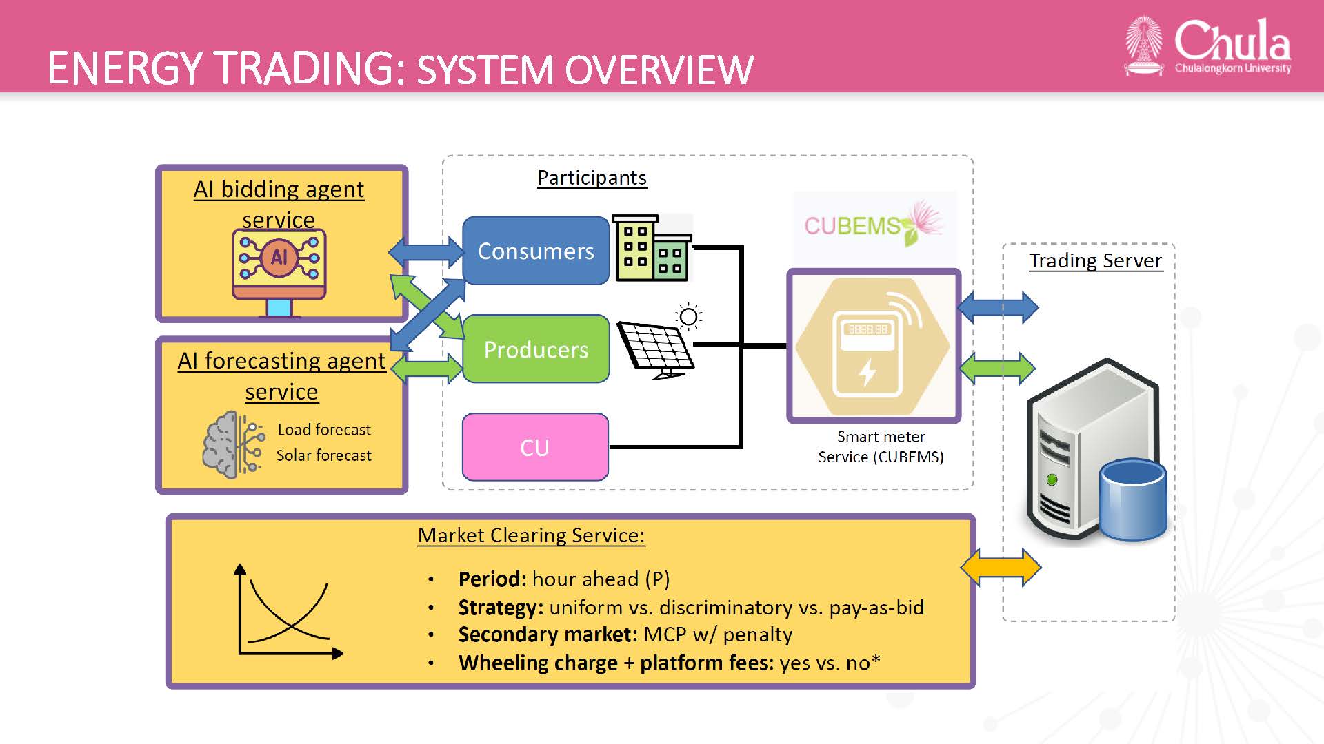 โดยการซื้อขายไฟฟ้าระหว่างอาคารนั้น ได้ใช้แพลตฟอร์มที่พัฒนาโดยคณาจารย์และนักวิจัยของจุฬาลงกรณ์มหาวิทยาลัย ซึ่งอาคารที่ถูกคัดเลือกร่วมโครงการ จะมีหน้าจอคอมพิวเตอร์ของตัวเอง ซึ่งฝั่งผู้ขายจะเสนอปริมาณไฟฟ้าและราคาที่เข้ามาในแพลตฟอร์มซึ่งต้องแข่งขันราคากันกับอาคารอื่นๆ ในขณะที่อาคารฝั่งผู้ซื้อจะแจ้งปริมาณไฟฟ้าที่ต้องการใช้และตัดสินใจเลือกซื้อไฟฟ้าจากอาคารที่เห็นว่าเสนอราคาต่ำสุด โดยในช่วงระยะเวลา 2 เดือนของการทดลองซื้อขายไฟฟ้ากันนั้น ราคาไฟฟ้าที่เสนอขายต่ำสุดเมื่อบวกรวมอัตรา Wheeling Charges แล้วอยู่ที่ประมาณ 2 บาทกว่าๆ ต่อหน่วย ส่วนที่เสนอราคาสูงสุดจะอยู่ที่ 4 บาทกว่าๆ - 5 บาท ต่อหน่วย