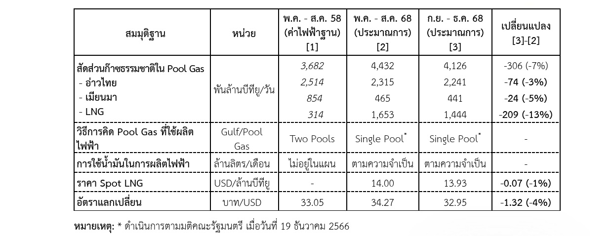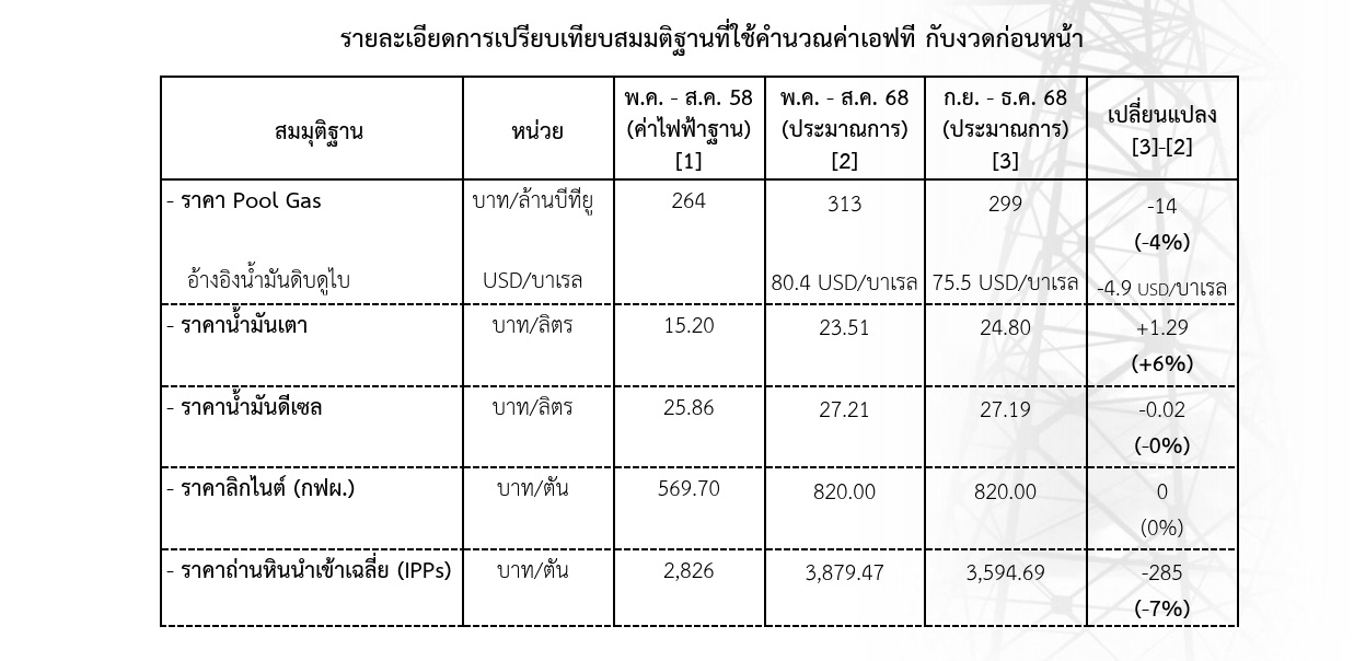 ดร.พูลพัฒน์ กล่าวว่า ปัจจัยหลักๆ ยังคงเป็นภาระการชดเชยต้นทุนคงค้าง (AF) ที่เกิดขึ้นจริงของ กฟผ. ซึ่งในช่วงที่ผ่านมาคาดว่าจะสามารถลดต้นทุนคงค้างลง 13,142 ล้านบาท แต่ราคาเชื้อเพลิงที่ใช้ผลิตไฟฟ้าจริงสูงกว่าการคาดการณ์ ทำให้สามารถลดต้นทุนคงค้างจริงได้เพียง 4,847 ล้านบาท ซึ่งภาระการชดเชยต้นทุนคงค้าง (AF) ยังคงเป็นปัจจัยลบที่กดดันค่าเอฟทีต่อไปจนกว่าจะหมดภาระ อย่างไรก็ตามแนวโน้มค่าเงินบาทเมื่อเทียบกับเงินดอลลาร์สหรัฐที่แข็งค่าขึ้นจากงวดก่อนหน้า 1.32 บาทต่อเหรียญสหรัฐ (งวด พ.ค. - ส.ค. 68) เป็น 32.95 บาทต่อเหรียญสหรัฐ และราคา LNG Spot ที่มีแนวโน้มลดลงเล็กน้อยตามราคาในตลาดโลกมาอยู่ที่ 13.9 เหรียญสหรัฐต่อล้านบีทียูส่งผลดีต่อต้นทุนการผลิตไฟฟ้า