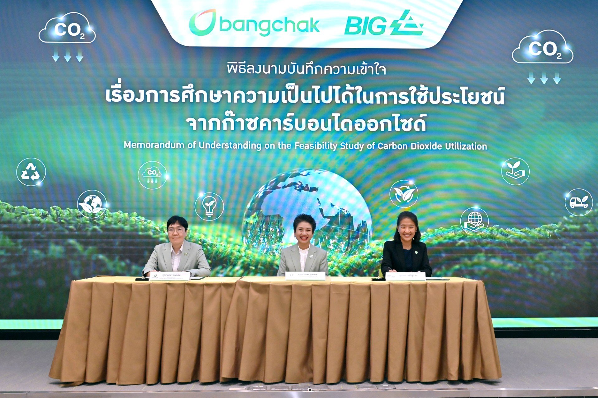 บริษัท บางจาก คอร์ปอเรชั่น จำกัด (มหาชน) จัดพิธีลงนามบันทึกความเข้าใจ เรื่องการศึกษาความเป็นไปได้ในการใช้ประโยชน์จากก๊าซคาร์บอนไดออกไซด์ กับ บีไอจี เพื่อศึกษาแนวทางการใช้ประโยชน์จากก๊าซคาร์บอนไดออกไซด์ (CO2 Utilization) ซึ่งเป็นการต่อยอดความร่วมมือกับสถาบันเทคโนโลยี แห่งเอเชียและ Mitico จากสหรัฐอเมริกา นำร่องใช้เทคโนโลยีดักจับก๊าซคาร์บอนไดออกไซด์ (Carbon Capture) ที่โรงกลั่นน้ำมันบางจาก พระโขนง เป็นโรงกลั่นน้ำมันรายแรกของประเทศไทยที่มีการศึกษาแนวทางการนำคาร์บอนที่ดักจับได้ไปใช้ประโยชน์ เพื่อสร้างมูลค่าเพิ่มอย่างเป็นรูปธรรม