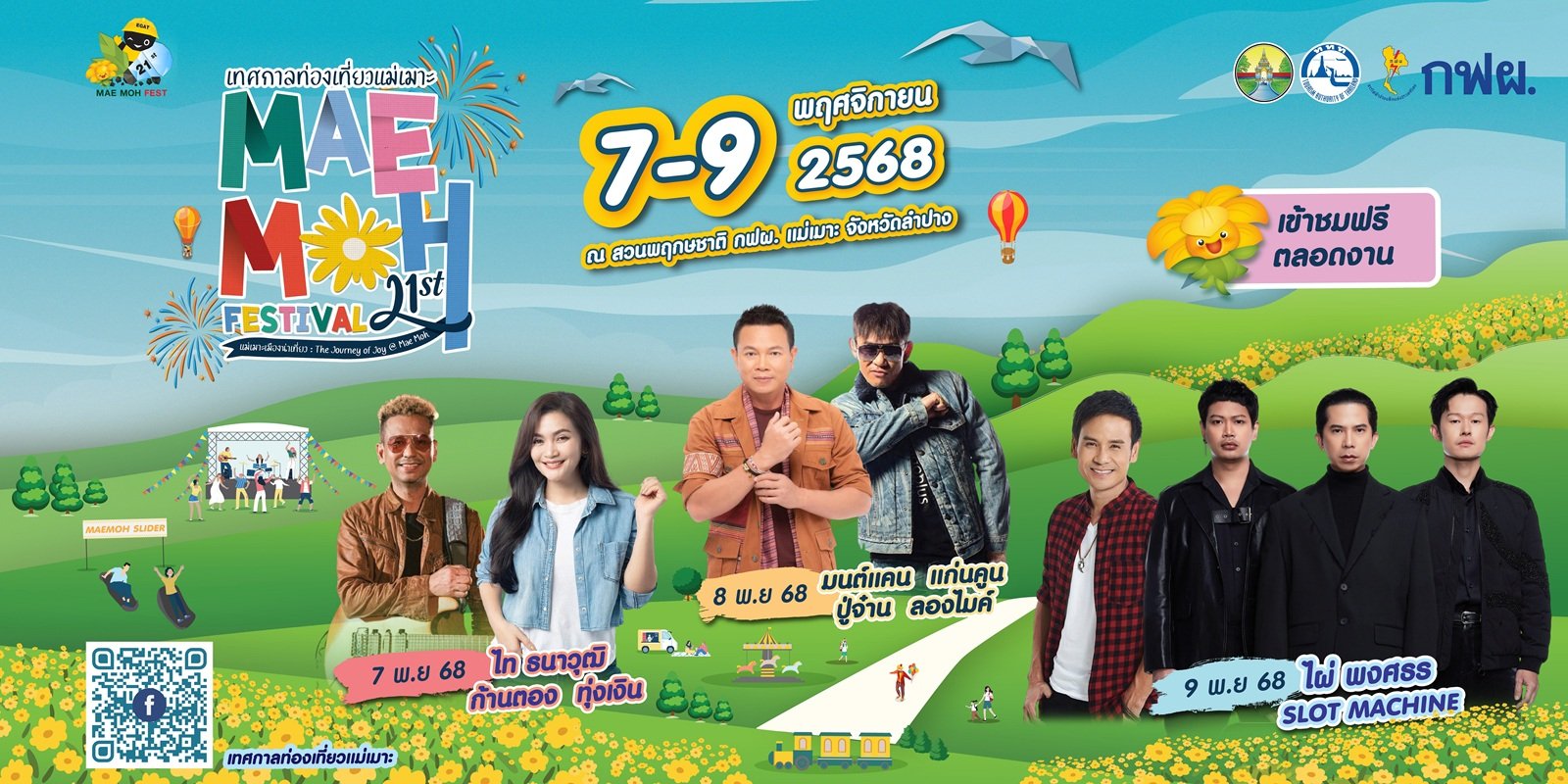 พบกับคอนเสิร์ตจากศิลปินชื่อดัง ไท ธนาวุฒิ ก้านตอง ทุ่งเงิน ปู่จ๋าน ลองไมค์ มนต์แคน แก่นคูน Slot Machine และไผ่ พงศธร สำหรับผู้ที่สนใจสามารถเที่ยวชมงานเทศกาลท่องเที่ยวแม่เมาะได้ฟรีตลอดงาน ระหว่างวันที่ 7-9 พฤศจิกายน 2568 ตั้งแต่เวลา 06.00 – 22.00 น. ณ สวนพฤกษชาติ กฟผ. แม่เมาะ อ.แม่เมาะ จ.ลำปาง โดยมีรถบริการรับส่งระหว่าง ลำปาง – กฟผ. แม่เมาะ ตลอดการจัดงาน สามารถติดตามรายละเอียดเพิ่มเติมได้ทาง Facebook Fanpage : เทศกาลท่องเที่ยวแม่เมาะ https://www.facebook.com/maemohfestival