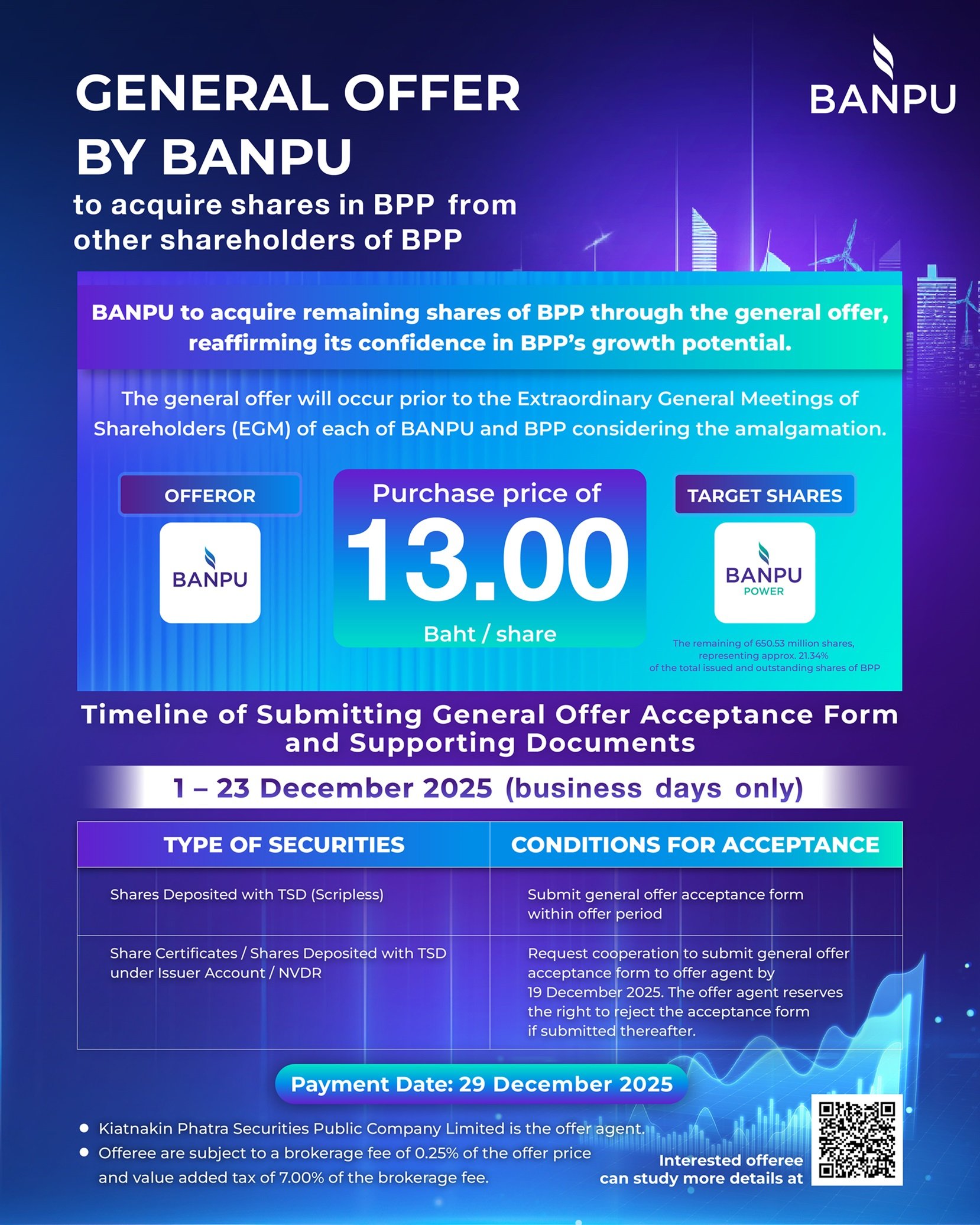 ในการนี้ บ้านปูได้แต่งตั้งให้ บริษัทหลักทรัพย์ เกียรตินาคินภัทร จำกัด (มหาชน) เป็นตัวแทนในการรับซื้อหุ้นแต่เพียงผู้เดียวสำหรับการเข้าทำข้อเสนอรับซื้อหุ้นในครั้งนี้ โดยผู้ขายหุ้นจะได้รับชำระเงินจากการขายหุ้น หลังหักค่าธรรมเนียมในการขายหุ้นในอัตราร้อยละ 0.25 ของราคารับซื้อหุ้น และภาษีมูลค่าเพิ่มในอัตราร้อยละ 7.00 ของค่าธรรมเนียมในการเสนอขายหุ้น ภายในวันที่ 29 ธันวาคม 2568 อย่างไรก็ดี สำหรับผู้แสดงเจตนาขายหุ้นที่ (1) ถือใบหุ้น (2) ฝากหุ้นไว้กับศูนย์รับฝากหลักทรัพย์ในบัญชีของผู้ออกหลักทรัพย์ (Issuer Account) (3) และผู้ถือ NVDR ควรยื่นแบบตอบรับข้อเสนอซื้อหุ้นและเอกสารประกอบที่เกี่ยวข้องกับตัวแทนในการรับซื้อหุ้นภายในวันที่ 19 ธันวาคม 2568 (ตัวแทนในการรับซื้อหุ้นขอสงวนสิทธิในการปฏิเสธการตอบรับข้อเสนอรับซื้อหุ้นหากยื่นภายหลัง) ทั้งนี้ ผู้แสดงเจตนาขายหุ้น BPP ให้แก่บ้านปูในธุรกรรมดังกล่าวและไม่ได้ถือหุ้น BPP แล้ว จะไม่มีสิทธิเข้าร่วมประชุมวิสามัญผู้ถือหุ้นของ BPP ซึ่งจะจัดขึ้นในวันพฤหัสบดีที่ 29 มกราคม 2569 เพื่อการพิจารณาอนุมัติการเข้าทำธุรกรรมการควบบริษัทและวาระอื่น ๆ ที่เกี่ยวข้อง