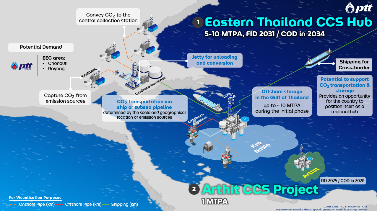 สำหรับการลงทุนใน เทคโนโลยีดักจับและกักเก็บคาร์บอนไดออกไซด์ (CCS) ได้มีการหารือร่วมกับหน่วยงานภาครัฐ เพื่อกำหนดแนวทางส่งเสริมและผลักดันเทคโนโลยี CCS ให้เกิดการใช้งานจริงในไทย พร้อมทั้งศึกษาและนำเสนอความเป็นไปได้ของการใช้ Hydrogen และ Ammonia Co-firing เป็นพลังงานทางเลือกในประเทศ โดยจะเริ่มโครงการนำร่องที่แหล่งอาทิตย์ในอ่าวไทย จะเริ่มดักจับและกักเก็บคาร์บอนในปี 2571 สามารถกักเก็บได้สูงสุดประมาณ 1 ล้านตันต่อปี โครงการดังกล่าวจะเป็นต้นแบบสำคัญสำหรับการพัฒนา CCS ในพื้นที่อื่น ๆ ของประเทศไทย รวมถึงการพัฒนา CCS Hub ในเขตพัฒนาพิเศษภาคตะวันออกในอนาคต
