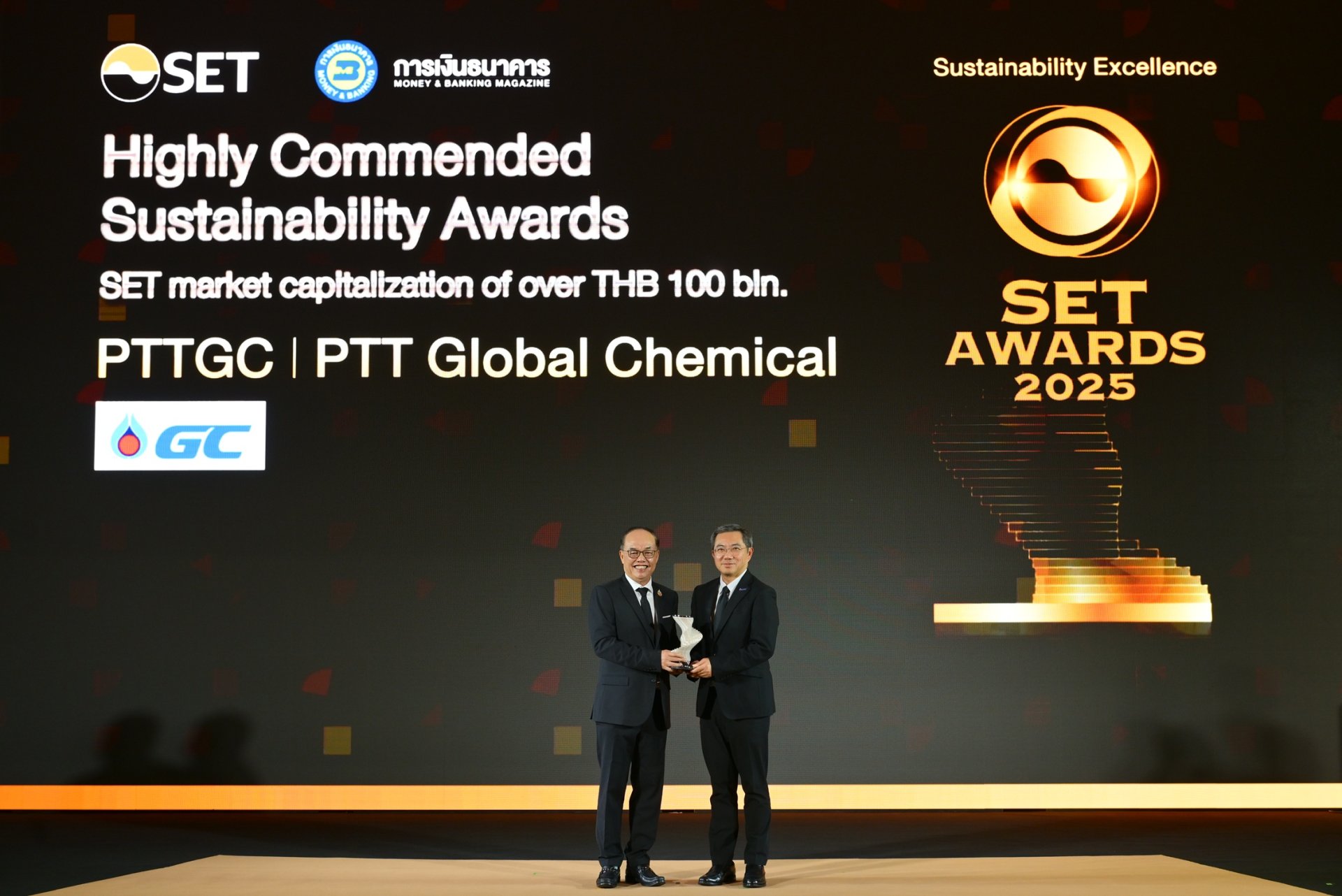 บริษัท พีทีที โกลบอล เคมิคอล จำกัด (มหาชน) หรือ GC ได้รับ 2 รางวัลอันทรงเกียรติจากเวที SET Awards 2025 ได้แก่ รางวัลเกียรติยศแห่งความสำเร็จด้านนวัตกรรม “Outstanding Innovative Company Awards” จากโครงการเชื้อเพลิงอากาศยานแบบยั่งยืน (Sustainable Aviation Fuel: SAF) และรางวัล “Highly Commended Sustainability Awards” องค์กรที่มีผลการดำเนินงานด้านความยั่งยืนโดดเด่นเป็นพิเศษสำหรับบริษัทจดทะเบียนไทย จัดโดยตลาดหลักทรัพย์แห่งประเทศไทยร่วมกับวารสารการเงินธนาคาร โดยมีนาย ณะรงค์ศักดิ์ จิวากานันต์ ประธานเจ้าหน้าที่บริหาร (CEO) และ นายพรรคพงษ์ วังรัตนโสภณ ประธานเจ้าหน้าที่ปฏิบัติการ กลุ่มธุรกิจผลิตภัณฑ์เคมีขั้นต้นและขั้นกลาง เป็นผู้รับมอบ ตอกย้ำจุดยืนการเป็นองค์กรนวัตกรรมที่มุ่งมั่นพัฒนานวัตกรรมและเทคโนโลยีเพื่อขับเคลื่อนอนาคต ดำเนินธุรกิจบนพื้นฐานของการสร้างสมดุุลสิ่งแวดล้อม สังคม เศรษฐกิจ และการกำกับดูแลกิจการที่ดี เพื่อความยั่งยืน