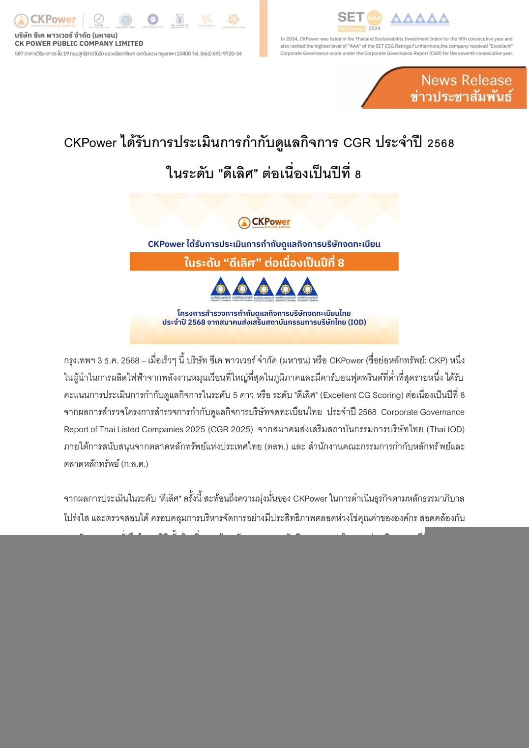 CKPower ได้รับการประเมินการกำกับดูแลกิจการ CGR ประจำปี 2568 ในระดับ "ดีเลิศ" ต่อเนื่องเป็นปีที่ 8