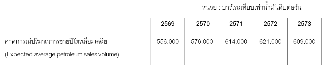 จากแผนงานดังกล่าว ปตท.สผ. ได้คาดการณ์ปริมาณการขายปิโตรเลียมเฉลี่ยต่อวัน (Expected average sales volume) จากโครงการปัจจุบัน ระหว่างปี 2569 – 2573 ดังรายละเอียดต่อไปนี้