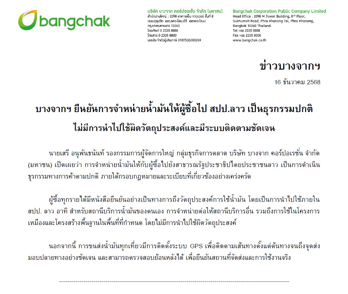 บางจากฯ ยืนยันการจำหน่ายน้ำมันให้ผู้ซื้อไป สปป.ลาว เป็นธุรกรรมปกติ