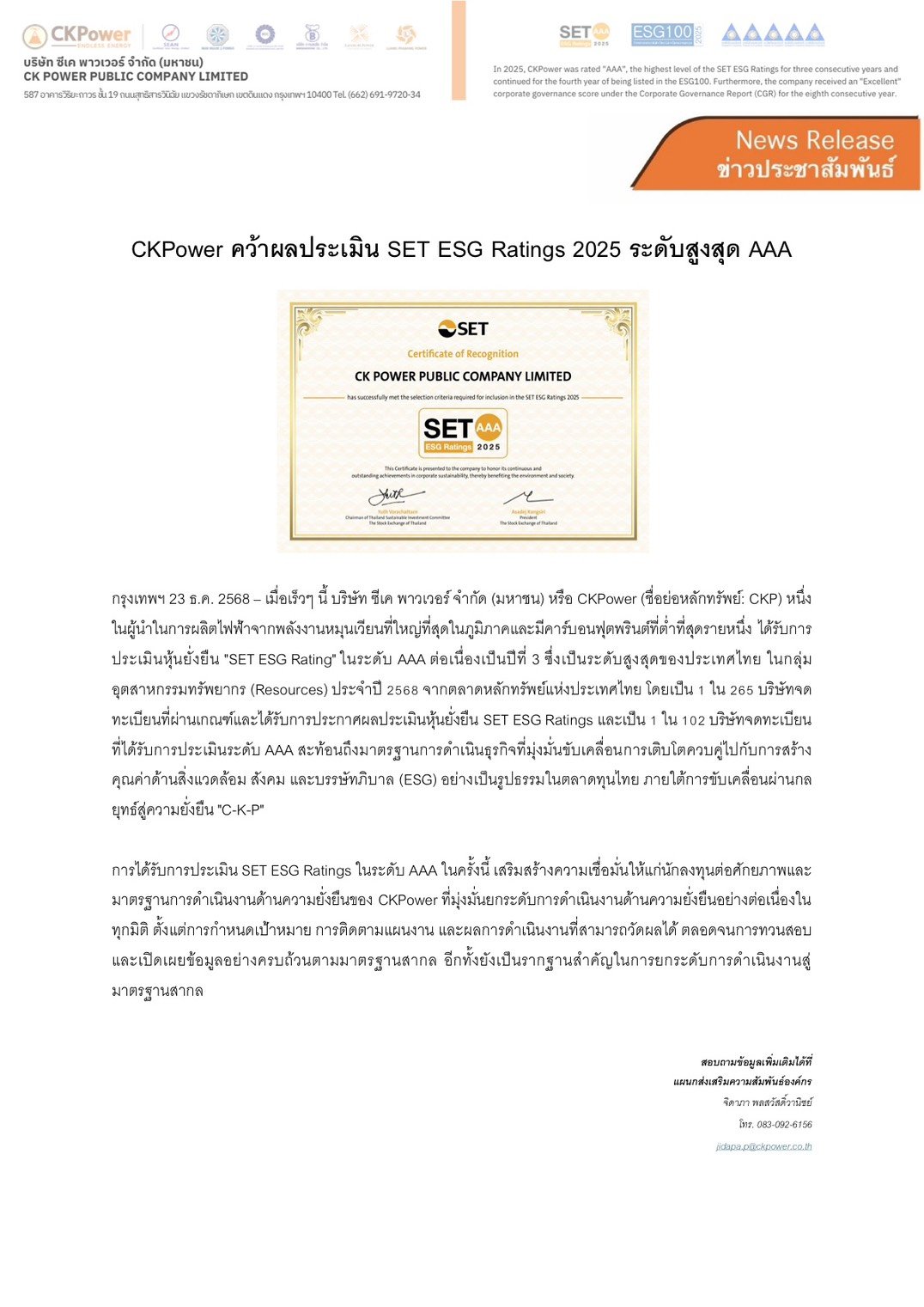 การได้รับการประเมิน SET ESG Ratings ในระดับ AAA ในครั้งนี้ เสริมสร้างความเชื่อมั่นให้แก่นักลงทุนต่อศักยภาพและมาตรฐานการดำเนินงานด้านความยั่งยืนของ CKPower ที่มุ่งมั่นยกระดับการดำเนินงานด้านความยั่งยืนอย่างต่อเนื่องในทุกมิติ ตั้งแต่การกำหนดเป้าหมาย การติดตามแผนงาน และผลการดำเนินงานที่สามารถวัดผลได้ ตลอดจนการทวนสอบและเปิดเผยข้อมูลอย่างครบถ้วนตามมาตรฐานสากล อีกทั้งยังเป็นรากฐานสำคัญในการยกระดับการดำเนินงานสู่มาตรฐานสากล