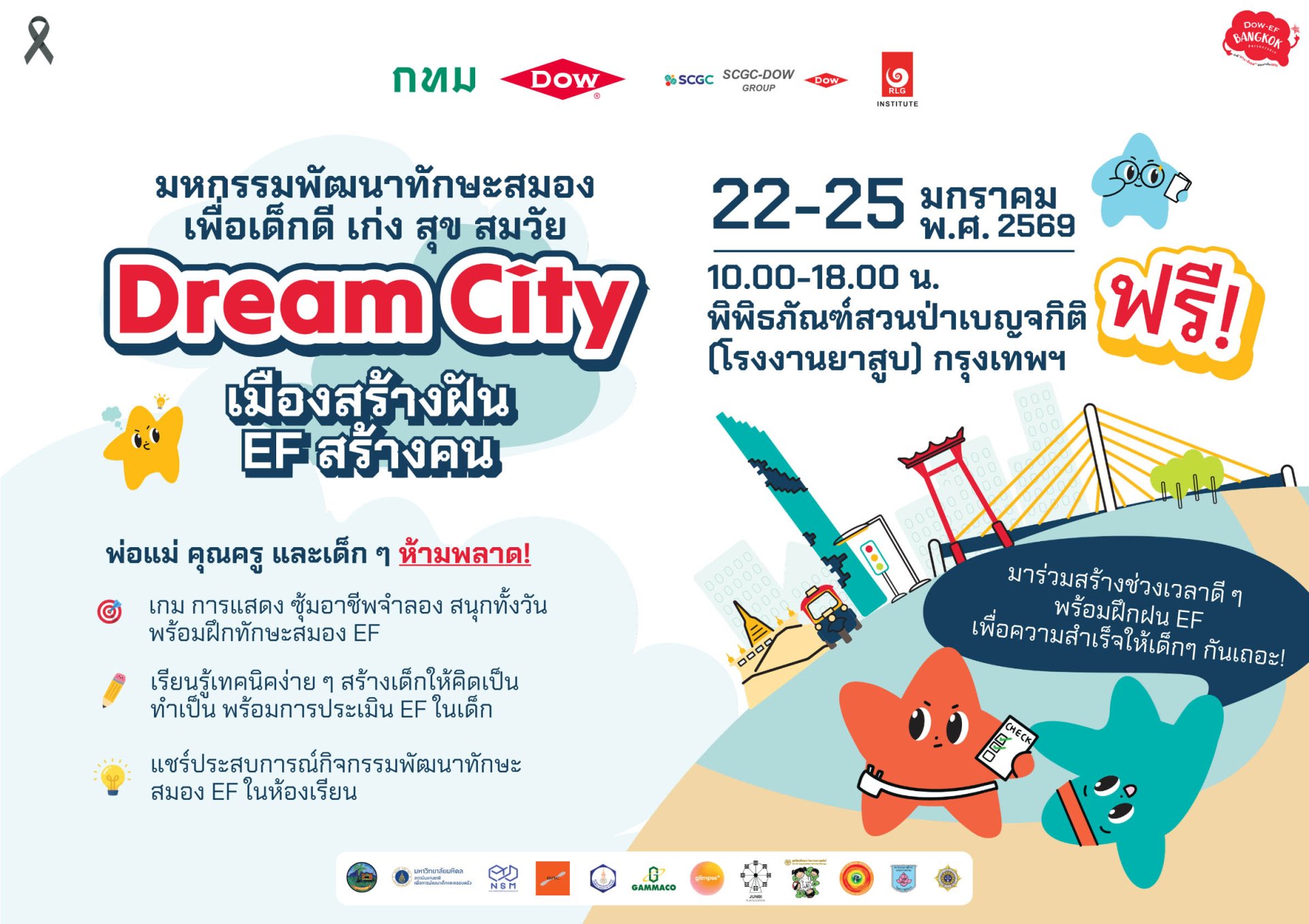 กรุงเทพมหานคร ร่วมกับ กลุ่มบริษัท ดาว ประเทศไทย (Dow) สถาบันรักลูก เลิร์นนิ่ง กรุ๊ป (RLG) สถาบันแห่งชาติเพื่อการพัฒนาเด็กและครอบครัว ม.มหิดล องค์การพิพิธภัณฑ์วิทยาศาสตร์แห่งชาติ (อพวช.) และพันธมิตร ขอเชิญชวนครอบครัวร่วมมหกรรมพัฒนาทักษะสมอง “ดรีมซิตี้: เมืองสร้างฝัน อีเอฟสร้างคน” เพื่อเสริมสร้างทักษะสมอง EF (Executive Functions) ให้เด็ก ๆ ได้เรียนรู้การคิดวิเคราะห์ วางแผน แก้ปัญหา ควบคุมอารมณ์ และอยู่ร่วมกับผู้อื่นอย่างมีความสุข ขณะเดียวกันยังเป็นโอกาสให้ผู้ปกครอง ครู และผู้ดูแลเด็กได้เรียนรู้แนวทางการส่งเสริมศักยภาพเด็ก และสร้างความสัมพันธ์ในครอบครัวอย่างใกล้ชิดอีกด้วย งานจัดขึ้นระหว่างวันที่ 22–25 มกราคม 2569 เวลา 10.00–18.00 น. ณ พิพิธภัณฑ์สวนป่าเบญจกิติ (โรงงานยาสูบ) กรุงเทพมหานคร โดยไม่เสียค่าใช้จ่าย