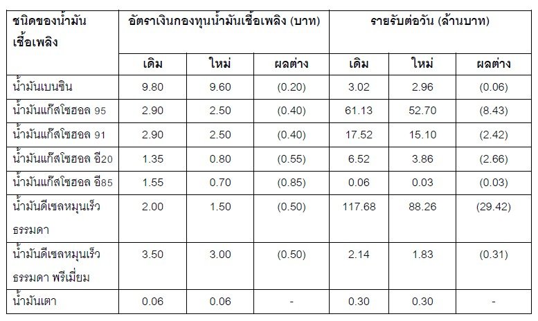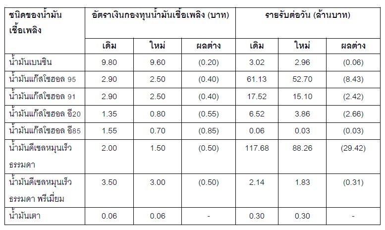 สำหรับ ฐานะกองทุนน้ำมันฯ ณ วันที่ 11 มกราคม 2569 กองทุนน้ำมันฯ ติดลบอยู่ที่ 3,090 ล้านบาท แบ่งเป็น บัญชีน้ำมันบวกอยู่ที่ 36,085 ล้านบาท และบัญชี LPG ติดลบอยู่ที่ 39,175 ล้านบาท ส่วนการปรับลดอัตราเงินส่งเข้ากองทุนน้ำมันฯ ประเภทน้ำมัน จะทำให้รายรับลดลงเหลือประมาณวันละ 43.33 ล้านบาท จากเดิมที่มีรายรับประมาณวันละ 208.37 ล้านบาท (รายละเอียดในตาราง)
