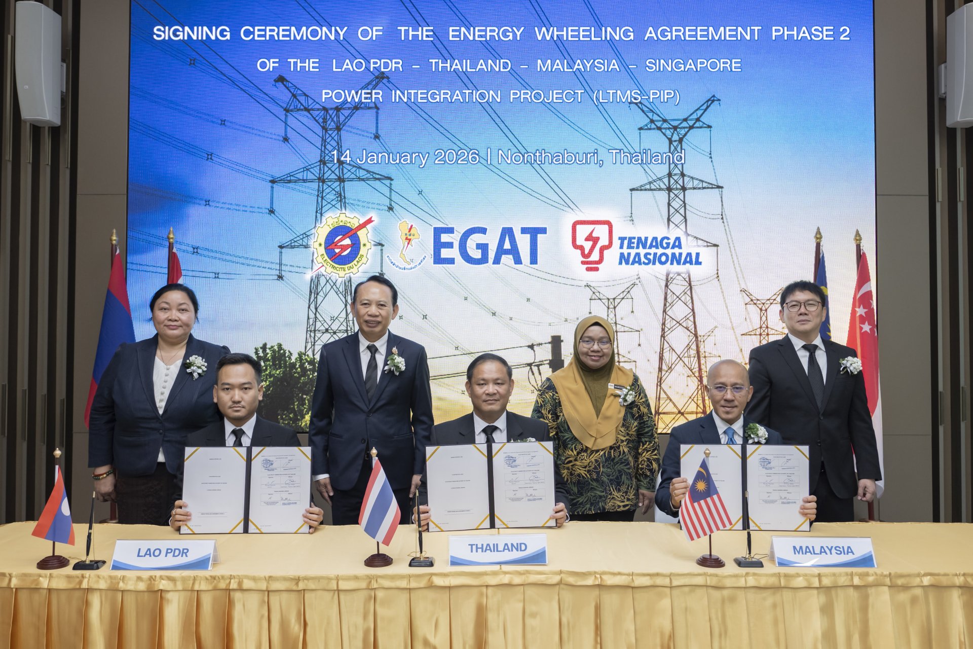 การไฟฟ้าฝ่ายผลิตแห่งประเทศไทย (กฟผ.) การไฟฟ้าลาว (Electricité du Laos: EDL) และการไฟฟ้ามาเลเซีย (Tenaga Nasional Berhad: TNB) ร่วมลงนามสัญญา Energy Wheeling Agreement (EWA) ภายใต้โครงการบูรณาการพลังงานไฟฟ้าระหว่าง สปป.ลาว ไทย มาเลเซีย และสิงคโปร์ ระยะที่ 2 (Lao PDR-Thailand-Malaysia-Singapore Power Integration Project Phase 2: LTMS-PIP 2.0) โดยมี ดร.ประเสริฐ สินสุขประเสริฐ ปลัดกระทรวงพลังงาน เป็นประธาน มีนายนรินทร์ เผ่าวณิช ผู้ว่าการ กฟผ. Mr. Souksavart Sosouphanh รองกรรมการผู้จัดการ การไฟฟ้าลาว (EDL) และ Mr. Hasmarizal Hassan ประธานเจ้าหน้าที่ด้านโครงข่ายไฟฟ้า การไฟฟ้ามาเลเซีย (TNB) ร่วมพิธีลงนาม ณ อาคาร 50 ปี กฟผ. สำนักงานใหญ่ กฟผ. จ.นนทบุรี