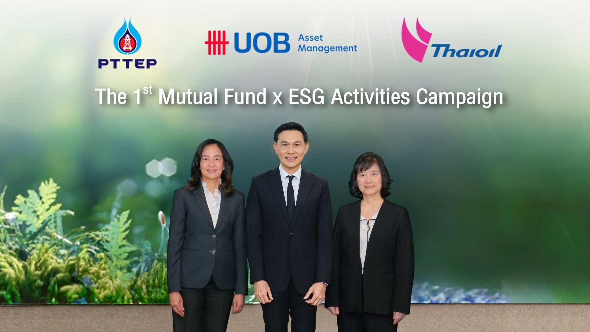 นายวนา พูลผล ประธานเจ้าหน้าที่บริหาร บลจ.ยูโอบี (ประเทศไทย) จำกัด นางชนมาศ ศาสนนันทน์ รองกรรมการผู้จัดการใหญ่ กลุ่มงานการเงินและการบัญชี บริษัท ปตท.สำรวจและผลิตปิโตรเลียม จำกัด (มหาชน) หรือ ปตท.สผ. และ นางวนิดา บุญภิรักษ์ รองกรรมการผู้จัดการใหญ่ ด้านการเงินและบัญชี บริษัท ไทยออยล์ จำกัด (มหาชน) ร่วมกันเปิดตัวโครงการ “The 1st Mutual Fund x ESG Activities Campaign” ที่เชื่อมโยงการบริหารการลงทุนเข้ากับกิจกรรมด้านสิ่งแวดล้อม สังคม และธรรมาภิบาล (ESG) อย่างเป็นรูปธรรม