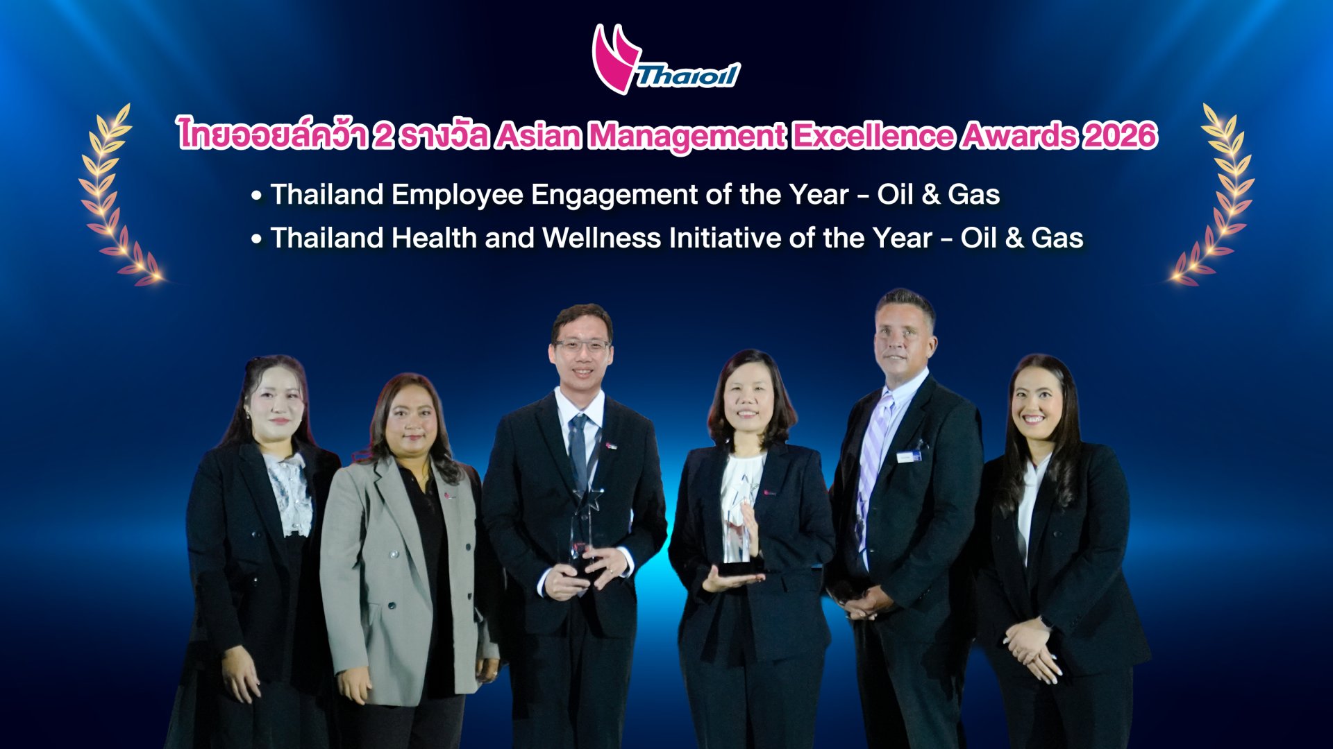 บริษัท ไทยออยล์ จำกัด (มหาชน) โดย คุณณัฐพล มีฤทธิ์ รองกรรมการผู้จัดการใหญ่-ด้านบริหารศักยภาพองค์กร พร้อมด้วย คุณจิดาภา สุนทรารัตน์พงษ์ ผู้จัดการฝ่ายบริหารจัดการทรัพยากรบุคคลและองค์กร เป็นผู้แทนบริษัทฯ เข้ารับรางวัล Asian Management Excellence Awards 2026 ใน 2 สาขาคือ Thailand Employee Engagement of the Year - Oil & Gas และ Thailand Health and Wellness Initiative of the Year - Oil & Gas ซึ่งจัดโดย Asian Business Review นิตยสารธุรกิจชั้นนำในเอเชียตะวันออกและเอเชียตะวันออกเฉียงใต้ ณ โรงแรมคอนราด กรุงเทพฯ