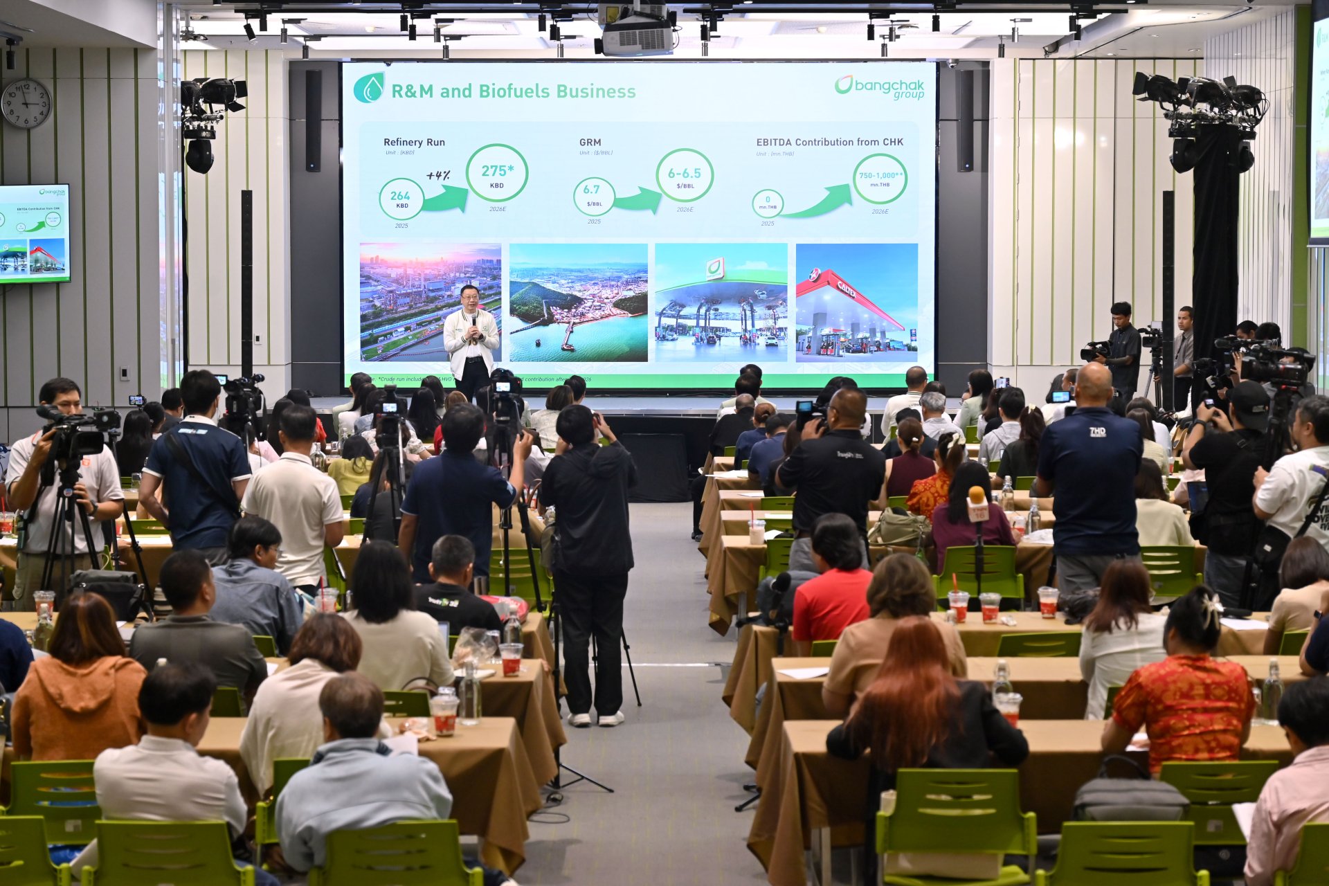 3.กลุ่มธุรกิจโรงกลั่น การตลาด และพลังงานชีวภาพปริมาณการกลั่นเพิ่มขึ้น จาก 264,000 บาร์เรลต่อวัน ในปี 2568 เป็นประมาณ 275,000 บาร์เรลต่อวัน ในปี 2569 คาดว่าค่าการกลั่นพื้นฐาน (GRM) อยู่ที่ 6-6.5 ดอลลาร์สหรัฐฯ ต่อบาร์เรล จากปี 2568 อยู่ที่ 6.7 ดอลลาร์สหรัฐฯ ต่อบาร์เรล ส่วน EBITDA จากการเข้าซื้อ Chevron Hong Kong (CHK) จะอยู่ประมาณ 750–1,000 ล้านบาท ในปี 2569 โดยคาดว่าจะคืนทุนภายใน 6-7 ปี