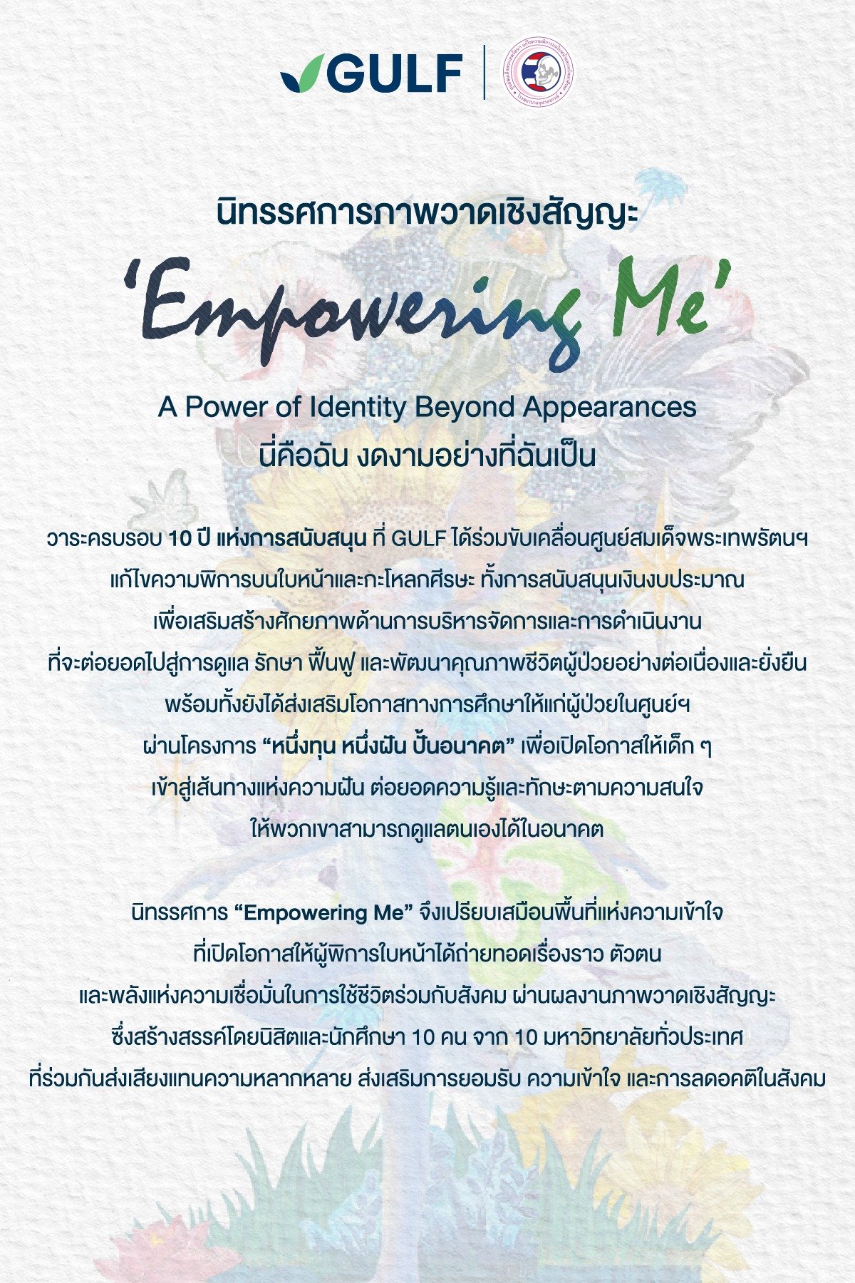 GULF เปิดตัวนิทรรศการ “Empowering Me” สะท้อนตัวตน ความฝันของผู้มีความผิดปกติบนใบหน้า พร้อมสนับสนุนศูนย์สมเด็จพระเทพรัตนฯ รพ.จุฬาฯ ต่อเนื่องปีที่ 10