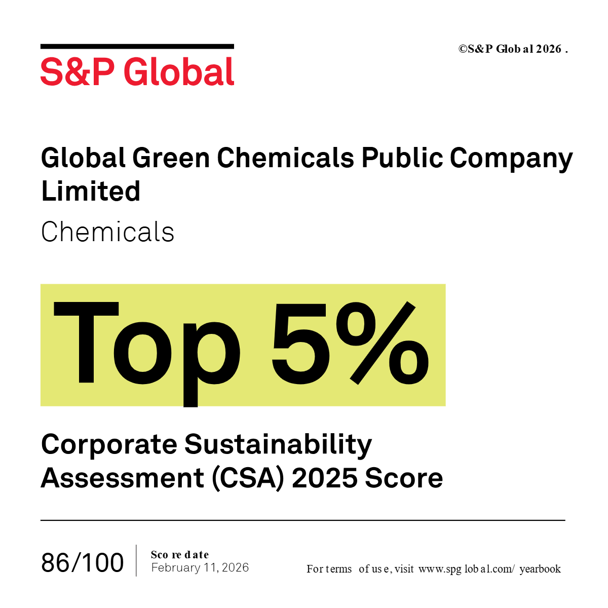 บริษัท โกลบอลกรีนเคมิคอล จำกัด (มหาชน) หรือ GGC ตอกย้ำความสำเร็จระดับสากล หลังได้รับการประเมินความยั่งยืนจาก S&P Global Corporate Sustainability Assessment (CSA) ประจำปี 2025 ด้วยคะแนนสูงถึง 86 คะแนน ก้าวขึ้นสู่อันดับ 2 ในกลุ่มธุรกิจเคมีภัณฑ์ และได้รับการจัดอันดับในกลุ่ม Top 5% ของโลก ใน S&P Global Sustainability Yearbook 2026 สะท้อนถึงความเชื่อมั่นในศักยภาพการบริหารจัดการตามหลัก ESG ที่โปร่งใสและเป็นรูปธรรม พร้อมเดินหน้าขับเคลื่อนธุรกิจสู่เป้าหมาย Net Zero 2050 เพื่อสร้างมูลค่าเพิ่มและโอกาสการเติบโตอย่างมั่นคงให้แก่ผู้ถือหุ้นในระยะยาว