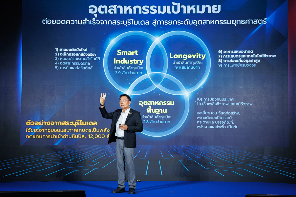 ทั้งนี้ ยุทธศาสตร์ขับเคลื่อนอุตสาหกรรมไทยก้าวกระโดดสู่ SMART INDUSTRY คือ 5 SMART + ร่วมลงมือทำ 1. Smart Industry: เพิ่มประสิทธิภาพการผลิต 2 เท่า 2. Smart Market: สร้างตลาดในประเทศ และขยายตลาดต่างประเทศ 3. Smart Funding: สนับสนุนเงินทุน SMEs เพื่อการเปลี่ยนผ่าน 4. Smart & Green Infrastructure: ส่งเสริมลดต้นทุนพลังงานและโลจิสติกส์ 5. Smart Government: ผลักดันราชการเร็ว สะดวก โปร่งใส พลัสด้วย PPPP Model (Public Private People Partnership) ความร่วมมือภาครัฐ เอกชน และประชาสังคม ร่วมทำบนจุดแข็งของตัวเอง ยกระดับ “สระบุรีโมเดล” ที่ประสบความสำเร็จ เป็น Thailand Model เพื่อขยายผลวิธีการทำงานด้วยความร่วมมือ โดยภาครัฐมีแนวทาง เอกชนขับเคลื่อน และประชาชนได้ประโยชน์