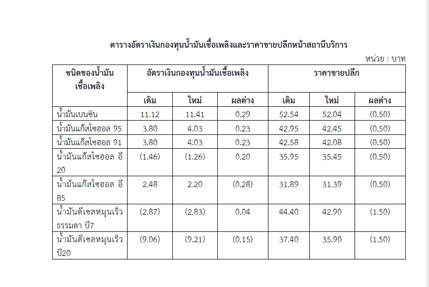 กลุ่มน้ำมันดีเซล ปรับลดอัตราเงินกองทุนน้ำมันดีเซลหมุนเร็วธรรมดา 0.04 บาทต่อลิตร เป็นชดเชย 2.83 บาทต่อลิตร ส่งผลให้ราคาขายปลีกลดลง 1.50 บาทต่อลิตร เป็น 42.90 บาทต่อลิตร ส่วนน้ำมันดีเซลหมุนเร็ว บี20 ปรับเพิ่มอัตราเงินกองทุน 0.15 บาทต่อลิตร เป็นชดเชย 9.21 บาทต่อลิตร ส่งผลให้ราคาขายปลีกลดลง1.50 บาทต่อลิตร เป็น 35.90 บาทต่อลิตร