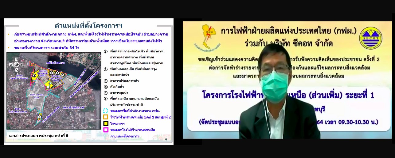 การไฟฟ้าฝ่ายผลิตแห่งประเทศไทย (กฟผ.) ร่วมกับ บริษัท ซีคอท จำกัด จัดเวทีประชุมรับฟังความคิดเห็นของประชาชน ครั้งที่ 2 ต่อการจัดทำร่างรายงานและมาตรการป้องกันและแก้ไขผลกระทบสิ่งแวดล้อมและมาตรการติดตามตรวจสอบผลกระทบสิ่งแวดล้อมในรายงาน EIA (Environmental Impact Assessment) โครงการโรงไฟฟ้าพระนครเหนือ (ส่วนเพิ่ม) ระยะที่ 1 ในรูปแบบการประชุมออนไลน์ ผ่านโปรแกรม Zoom เพื่อเว้นระยะห่างทางสังคมลดเสี่ยงโควิด-19 โดยมีนายประเสริฐศักดิ์ เชิงชวโน รองผู้ว่าการพัฒนาโรงไฟฟ้าและพลังงานหมุนเวียน กฟผ. เป็นผู้กล่าวต้อนรับ และนายขรรชัย เกรียงไกรอุดม ผู้เชี่ยวชาญด้านสิ่งแวดล้อม บริษัท ซีคอท จำกัด เป็นผู้นำเสนอรายละเอียดโครงการ โดยมีประชาชนในพื้นที่ศึกษาโครงการฯ และประชาชนที่สนใจเข้าร่วมรับฟังความคิดเห็น จำนวนประมาณ 190 คน และมีผู้ร่วมแสดงความคิดเห็น จำนวน 6 คน