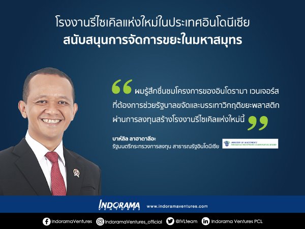 บาห์ลิล ลาฮาดาลีอะ รัฐมนตรีกระทรวงการลงทุน สาธารณรัฐอินโดนีเซีย กล่าวว่า “ผมรู้สึกชื่นชมโครงการของอินโดรามา เวนเจอร์ส ที่ต้องการช่วยรัฐบาลขจัดและบรรเทาวิกฤติขยะพลาสติก ผ่านการลงทุนสร้างโรงงานรีไซเคิลแห่งใหม่นี้ ถึงเวลาแล้วที่รัฐบาลและพวกเราทุกคนต้องลงมือแก้ไขปัญหาขยะ เราพร้อมเปิดรับนักลงทุนที่มุ่งสร้างผลกระทบเชิงบวกต่อชุมชนและสิ่งแวดล้อม เพื่อร่วมกันปกป้องความหลากหลายทางชีวภาพของท้องทะเลที่อุดมสมบูรณ์ เพื่อลูกหลานของเรา”