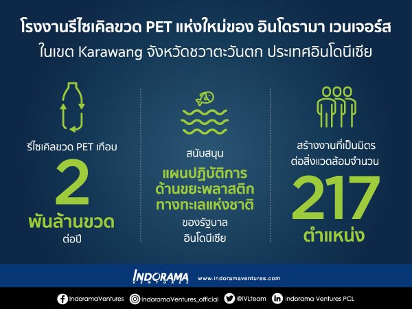 “เอกลักษณ์ของพลาสติก PET ซึ่งใช้ผลิตขวดน้ำและเครื่องดื่มต่างๆ คือ สามารถนำไปรีไซเคิลได้ 100% และไม่ควรจะถูกปล่อยให้รั่วไหลไปในมหาสมุทร วันนี้ไอวีแอลประกาศสร้างโรงงานรีไซเคิล PET แห่งใหม่ใน Karawang ซึ่งจะสามารถรีไซเคิลขวด PET ใช้งานแล้วปีละ 1.92 พันล้านขวดจากทั่วทั้งอินโดนีเซีย ภายในปี 2566” นายยาโชวาดัน โลเฮีย ประธานเจ้าหน้าที่บริหารด้านความยั่งยืน อินโดรามา เวนเจอร์ส กล่าว “เรารู้สึกยินดีที่ได้มีส่วนส่งเสริมเศรษฐกิจของอินโดนีเซีย ผ่านการจ้างงานที่เป็นมิตรต่อสิ่งแวดล้อมจำนวน 217 ตำแหน่ง และการสร้างงานทางอ้อมในพื้นที่ดังกล่าว การประกาศสร้างโรงงานในวันนี้เกิดขึ้นได้เพราะแผนระดับชาติของอินโดนีเซียที่มุ่งลดขยะพลาสติกทางทะเลลงร้อยละ 70 ลดขยะมูลฝอยลงร้อยละ 30 และจัดการขยะมูลฝอยร้อยละ 70 ภายในปี 2568”