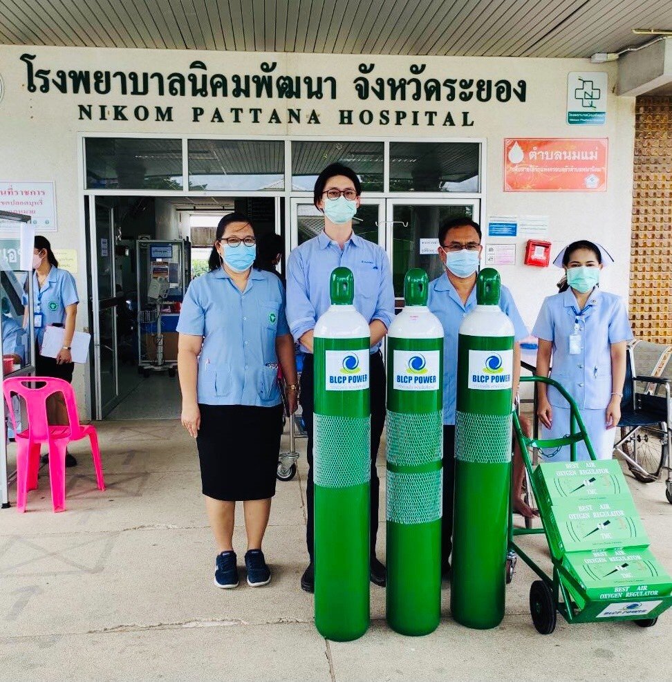 คุณยุทธนา เจริญวงศ์ กรรมการผู้จัดการ บริษัท บีแอลซีพี เพาเวอร์ จำกัด(BLCP) ส่งมอบถังออกซิเจนทางการแพทย์ ขนาด 6 คิว จำนวน 13 ถัง พร้อมอุปกรณ์ต่อควบ และรถเข็นสำหรับเคลื่อนย้ายถังออกซิเจน จำนวน 3 คันให้กับสาธารณสุขจังหวัดระยอง และโรงพยาบาลนิคมพัฒนาจังหวัดระยอง มูลค่ารวมทั้งสิ้น 130,000 บาท โดย นายแพทย์สาธารณสุขจังหวัดระยอง(นายแพทย์สุนทรเหรียญภูมิการกิจ) และผู้อำนวยการโรงพยาบาลนิคมพัฒนา จังหวัดระยอง(นายแพทย์โกมล ภู่ถาวรทรัพย์) ให้เกียรติรับมอบอุปกรณ์ดังกล่าว